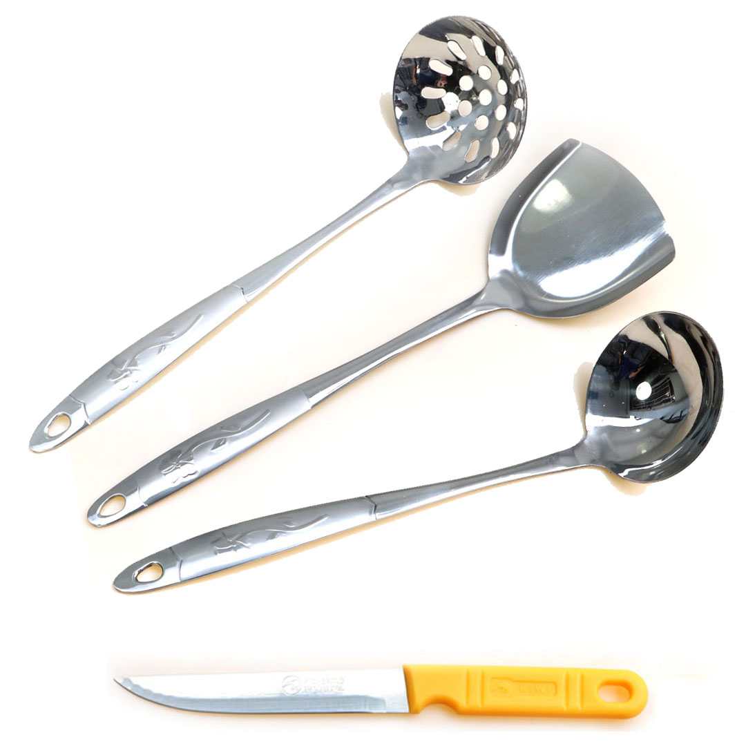 Combo vá múc canh, vá lỗ vớt cái và xẻng chiên xào inox cao cấp tặng dao bếp gọt trái cây CVX01 | Gia dụng bếp