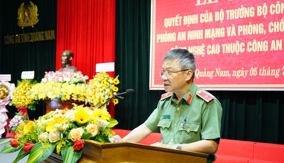 Phát biểu tại buổi lễ, Thiếu tướng Nguyễn Đức Dũng – Giám đốc Công an tỉnh Quảng Nam cho rằng, cuộc cách mạng công nghệ 4.0 tạo ra nhiều cơ hội, thuận lợi đối với sự phát triển kinh tế, văn hóa, xã hội của đất nước. Tuy nhiên, bênh cạnh những thuận lợi cũng xuất hiện nhiều nhiều nguy cơ, thách thức tác động, ảnh hưởng đến tình hình An ninh quốc gia, trật tự xã hội. Nhiều đối tượng lợi dụng công nghệ 4.0 hoạt động phạm tội như: lừa đảo, chiếm đoạt tài sản, tổ chức đánh bạc và đánh bạc qua mạng… Xuất phát từ tình hình đó, việc thành lập Phòng PA05 là rất cần thiết, nhằm kịp thời phát hiện, đấu tranh trấn áp tội phạm công nghệ cao.