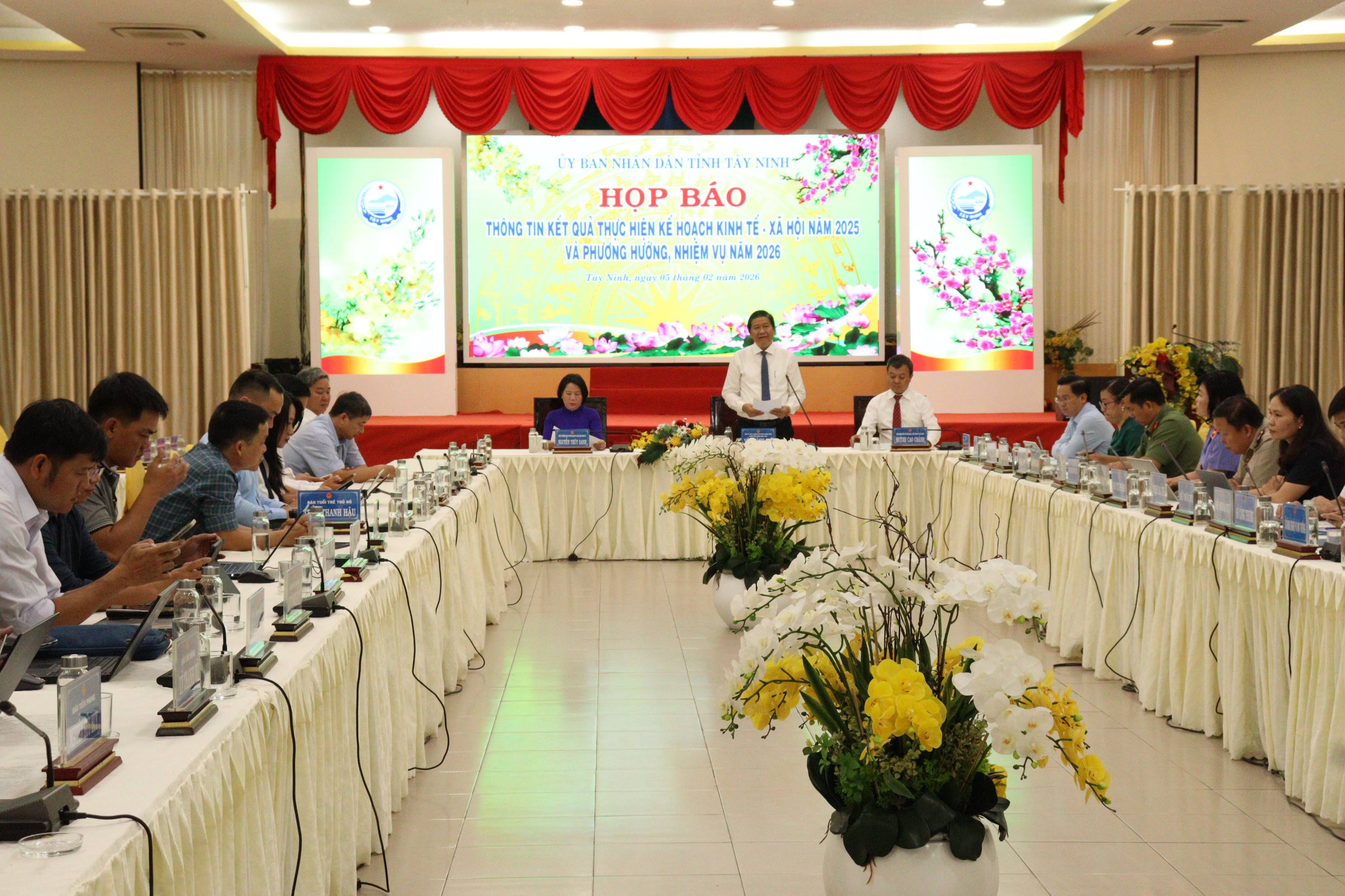 Chiều ngày 05/02, UBND tỉnh Tây Ninh tổ chức họp báo thông tin tình hình kinh tế - xã hội năm 2025 và nhiệm vụ năm 2026. Chánh văn phòng UBND tỉnh, người phát ngôn UBND tỉnh Võ Thành Trí; Phó Trưởng ban Tuyên giáo và Dân vận Tỉnh ủy Nguyễn Thúy Oanh; Phó Giám đốc Sở Văn hóa, Thể thao và Du lịch Huỳnh Cao Chánh chủ trì buổi họp báo. Dự buổi họp báo có lãnh đạo các sở ngành, địa phương cùng các cơ quan báo chí của tỉnh và gần 50 cơ quan thông tấn, báo chí đăng ký tác nghiệp trên địa bàn tỉnh.