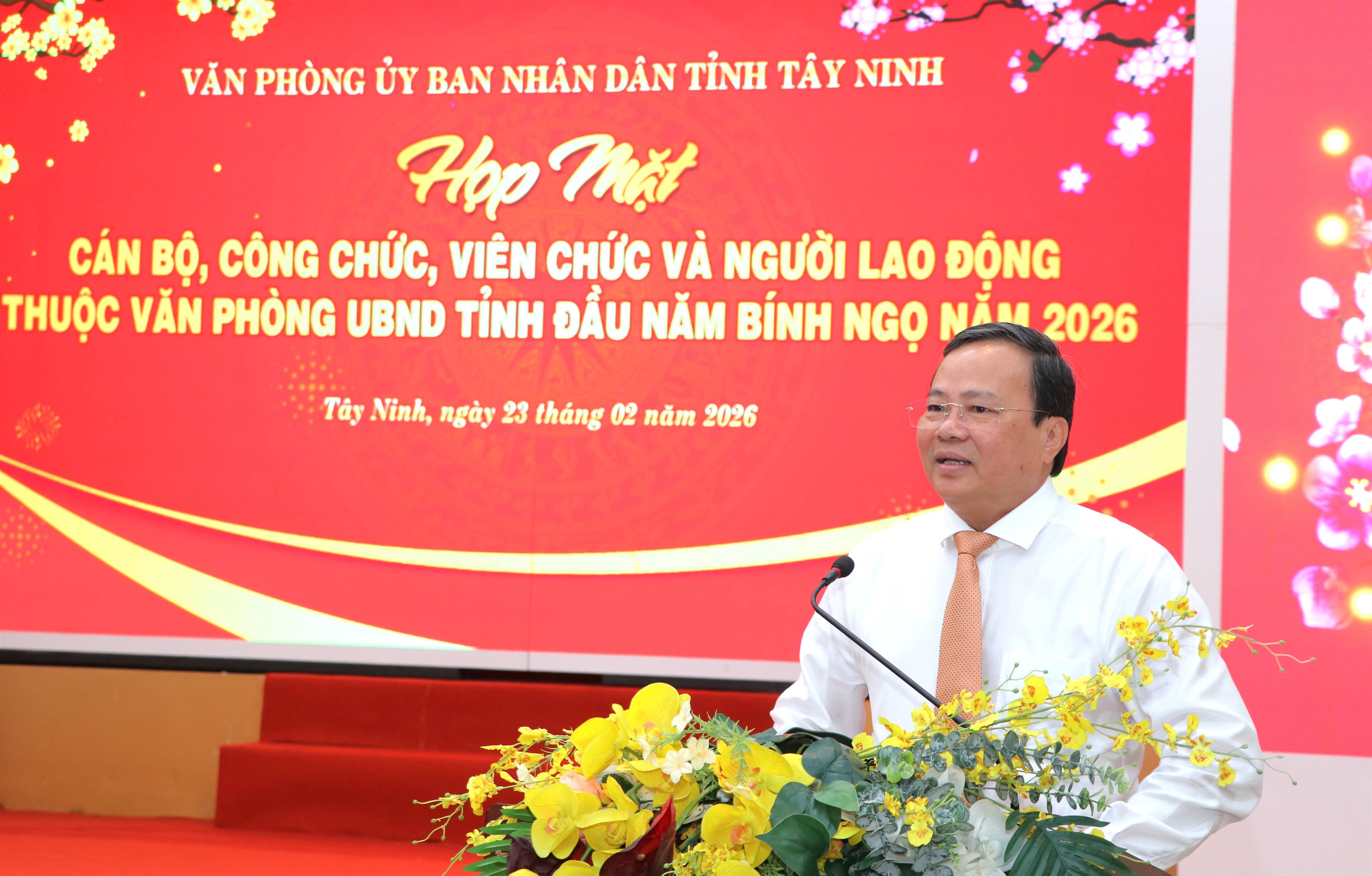 Thời sự - Chính trị Văn phòng UBND tỉnh họp mặt, giao nhiệm vụ đầu năm Bính Ngọ 2026 Nhân dịp năm mới Bính Ngọ 2026, sáng ngày 23/02/2026, Văn phòng UBND tỉnh Tây Ninh tổ chức buổi Họp mặt cán bộ, công chức, viên chức và người lao động thuộc Văn phòng UBND tỉnh đầu năm Bính Ngọ năm 2026. - Doanh nghiệp Hàn Quốc chúc Tết UBND tỉnh Tây Ninh nhân dịp Xuân Bính Ngọ 2026