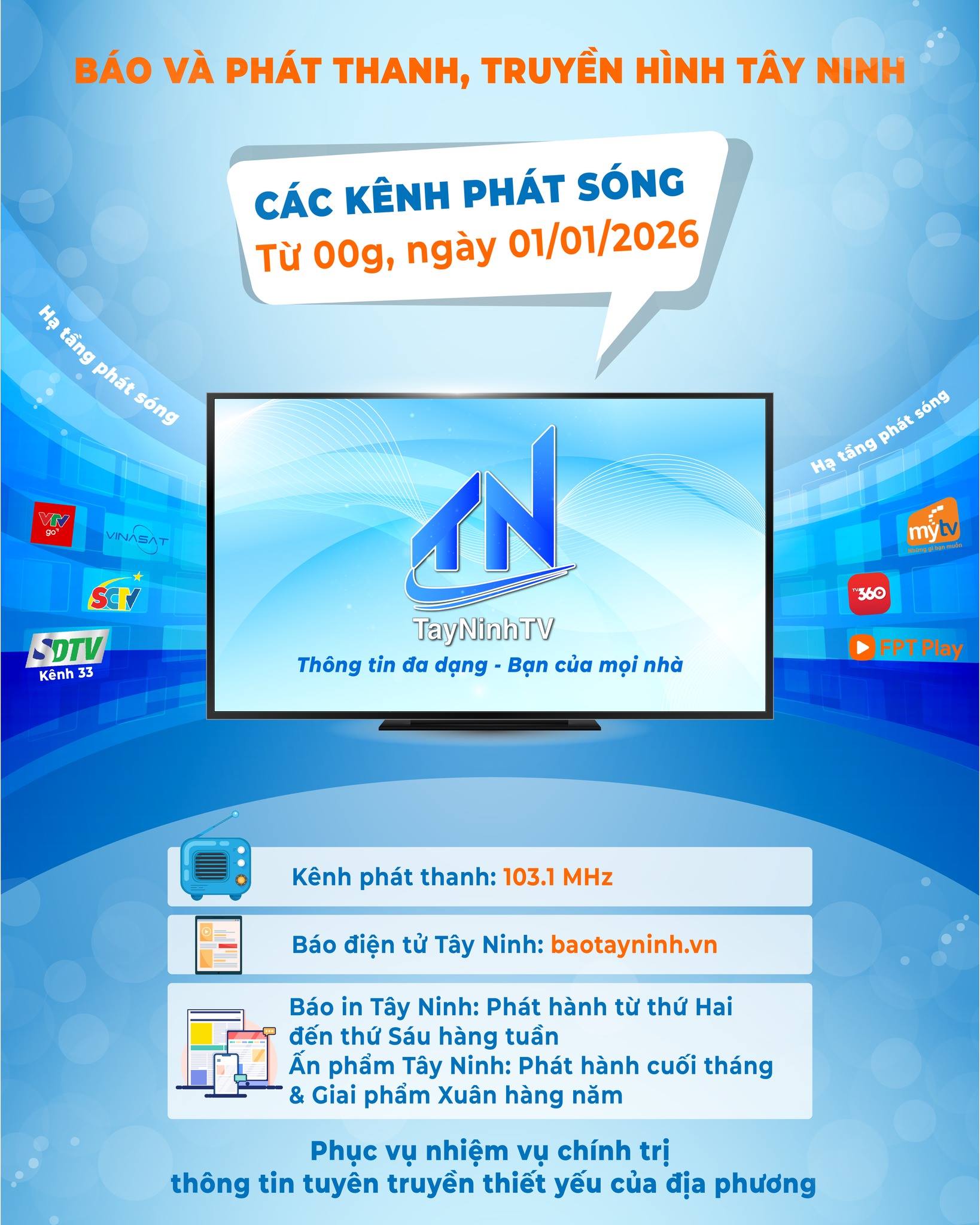 | Thông báo Báo và Phát thanh, Truyền hình Tây Ninh điều chỉnh hệ thống kênh và nền tảng truyền thông từ ngày 01/01/2026 Kể từ 0 giờ ngày 01/01/2026, Báo và Phát thanh, Truyền hình Tây Ninh chính thức triển khai một số điều chỉnh nhằm sắp xếp, tinh gọn và nâng cao hiệu quả hoạt động các kênh, nền tảng truyền thông của đơn vị. - Vận hành Hệ thống thông tin giải quyết thủ tục hành chính theo mô hình tập trung của Bộ Xây dựng từ ngày 01/01/2026
