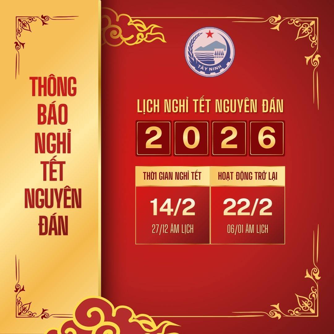 | Thông báo Thông Báo Nghỉ Tết Và Treo Cờ Tổ Quốc Tết Nguyên Đán Bính Ngọ 2026 UBND tỉnh vừa ban hành Thông báo về việc nghỉ Tết và treo cờ Tổ quốc nhân dịp Tết Nguyên đán Bính Ngọ năm 2026, nhằm tạo điều kiện để cán bộ, công chức, viên chức, người lao động và Nhân dân vui Xuân, đón Tết an toàn, tiết kiệm, lành mạnh, đồng thời bảo đảm các hoạt động kinh tế – xã hội diễn ra thông suốt. - Thành lập Ban Quản lý dự án Đầu tư xây dựng Công trình giao thông tỉnh Tây Ninh