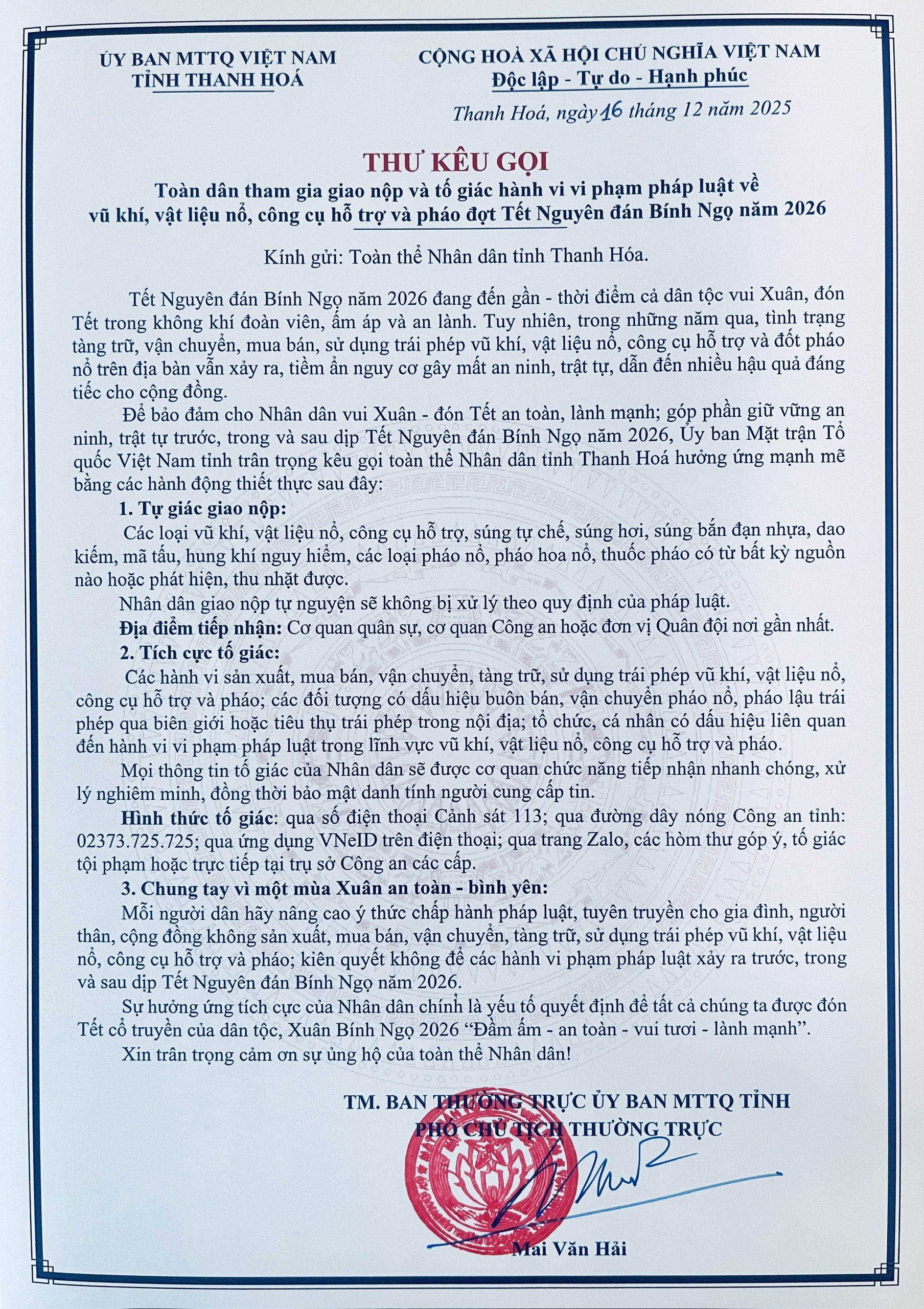 Thư kêu gọi toàn dân tham gia giao nộp và tố giác hành vi vi phạm pháp luật về vũ khí, vật liệu nổ,... -