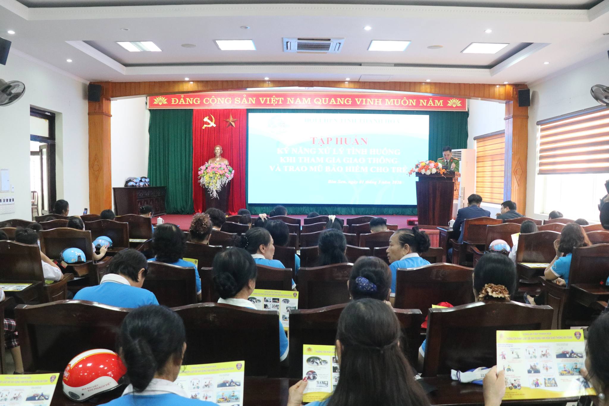 Tập huấn kỹ năng xử lý tình huống khi tham gia giao thông cho hội viên phụ nữ và trẻ em Ngày 1/3, Hội LHPN tỉnh Thanh Hóa tổ chức hội nghị tập huấn kỹ năng xử lý tình huống khi tham gia giao thông và trao mũ bảo hiểm cho trẻ em tại phường Bỉm Sơn. Dự hội nghị có đồng chí Lương Thị Hạnh, Tỉnh ủy viên, Chủ tịch Hội LHPN tỉnh. -