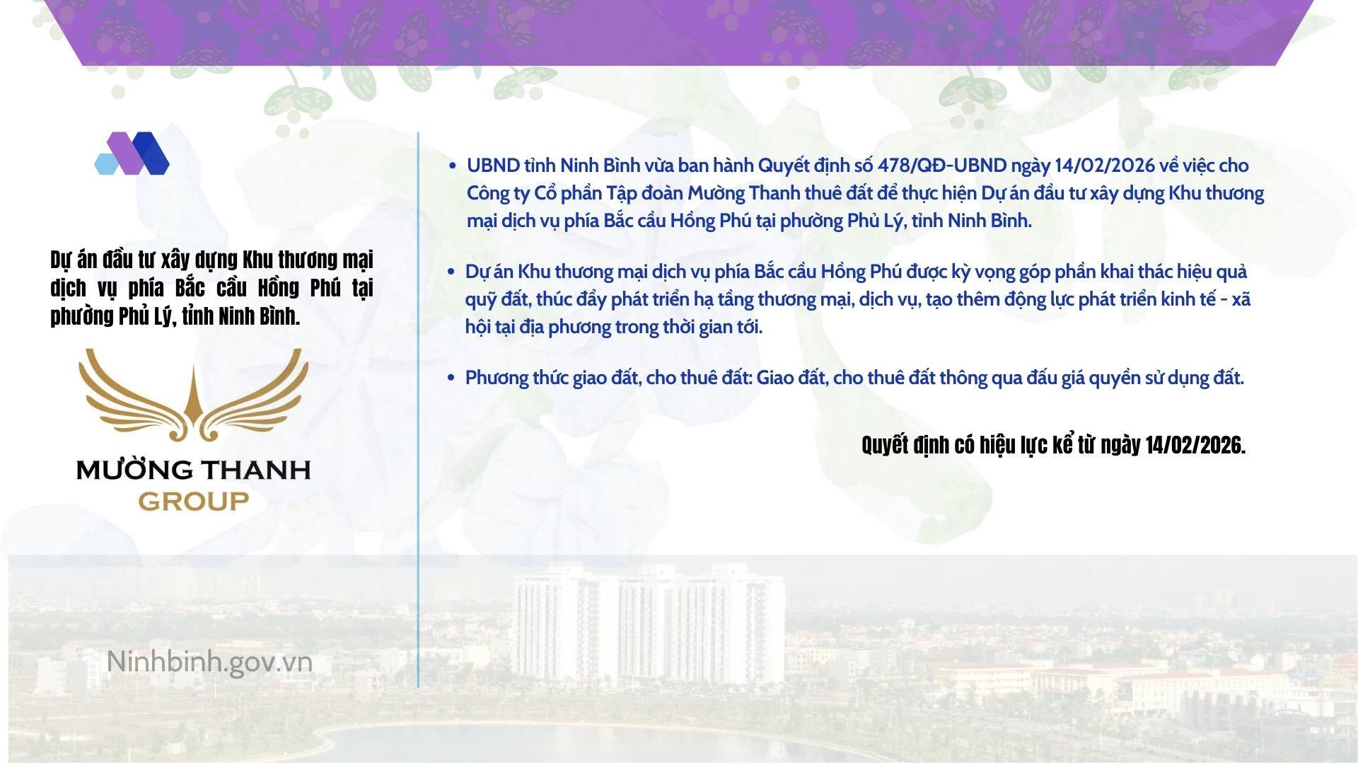 | Thông tin được quan tâm nhiều Hội nghị công bố Quyết định của UBND tỉnh về công tác cán bộ (1135 Lượt xem ) Họp Đoàn đại biểu Đảng bộ tỉnh Ninh Bình dự Đại hội đại biểu toàn quốc lần thứ XIV của Đảng (1023 Lượt xem ) Ninh Bình: 6 điểm bắn pháo hoa nổ tầm thấp dịp Tết Nguyên đán Bính Ngọ và lễ hội năm 2026 (829 Lượt xem ) Đơn giá bồi thường thiệt hại về cây trồng, vật nuôi khi Nhà nước thu hồi đất trên địa bàn tỉnh Ninh Bình từ ngày 01/01/2026 (707 Lượt xem ) Bộ Nông nghiệp và Môi trường chỉ đạo khẩn trương triển khai các quy định mới tháo gỡ khó khăn về đất đai (597 Lượt xem ) Công bố Quyết định bổ nhiệm Phó Giám đốc Sở Ngoại vụ Ninh Bình (529 Lượt xem ) UBND tỉnh phê duyệt danh sách thôn, xã vùng đồng bào dân tộc thiểu số và miền núi; xã khu vực I, II trên địa bàn tỉnh Ninh Bình giai đoạn 2026-2030 (507 Lượt xem ) Bộ Nội vụ hướng dẫn tổ chức Hội nghị cán bộ, công chức, viên chức và người lao động (463 Lượt xem ) Ninh Bình ban hành Nghị quyết quy định mức quà tặng đối với một số đổi tượng nhân dịp Tết Nguyên đán hằng năm trên địa bàn tỉnh (457 Lượt xem ) UBND tỉnh ban hành Kế hoạch triển khai sắp xếp, tổ chức lại các cơ sở giáo dục mầm non, giáo dục phổ thông thuộc thẩm quyền quản lý của UBND cấp xã (446 Lượt xem ) UBND tỉnh Ninh Bình công bố các quyết định và triển khai công tác sắp xếp các cơ sở y tế (405 Lượt xem ) Ninh Bình: Rộn ràng kế hoạch tổ chức Chợ hoa Xuân Bính Ngọ 2026 (362 Lượt xem ) UBND tỉnh phê duyệt Kế hoạch tuyển sinh vào lớp 10 THPT và giáo dục nghề nghiệp – giáo dục thường xuyên năm học 2026–2027 (349 Lượt xem ) UBND tỉnh Ninh Bình Quyết định cho Công ty Cổ phần Tập đoàn Mường Thanh thuê đất để thực hiện Dự án đầu tư xây dựng Khu thương mại dịch vụ phía Bắc... (318 Lượt xem ) Ninh Bình điều chỉnh Chương trình phát triển nhà ở giai đoạn 2021-2030 (290 Lượt xem ) Họp Hội đồng thẩm định điều chỉnh Quy hoạch tỉnh Ninh Bình thời kỳ 2021–2030, tầm nhìn đến năm 2050 (282 Lượt xem ) Công bố quyết định bổ nhiệm 129 Chỉ huy trưởng Ban Chỉ huy Quân sự cấp xã (267 Lượt xem ) Ninh Bình ban hành quy định mới về điều kiện được hưởng chính sách hỗ trợ nhà ở xã hội đối với người đã có nhà ở nhưng ở xa nơi làm việc (260 Lượt xem ) Kế hoạch tổ chức Lễ hội Khai ấn Đền Trần phường Nam Định, tỉnh Ninh Bình - Xuân Bính Ngọ năm 2026 (259 Lượt xem ) Danh sách gọi công dân nhập ngũ và thực hiện nghĩa vụ tham gia công an nhân dân năm 2026 (254 Lượt xem ) Ninh Bình: Công bố Quyết định phê chuẩn Phó Chủ tịch UBND tỉnh nhiệm kỳ 2021-2026 (248 Lượt xem ) UBND tỉnh chỉ thị tổ chức Tết Nguyên đán Bính Ngọ 2026 vui tươi, lành mạnh, an toàn, tiết kiệm (246 Lượt xem ) Hướng dẫn các bước giới thiệu người tham gia ứng cử đại biểu Quốc hội khóa XVI và HĐND tỉnh, nhiệm kỳ 2026-2031 (242 Lượt xem ) Đồng chí Bí thư Tỉnh ủy Đặng Xuân Phong và đồng chí Chủ tịch UBND tỉnh Trần Huy Tuấn được bầu vào Ban Chấp hành Trung ương Đảng khóa XIV (238 Lượt xem ) Thanh Bình ban hành Kế hoạch cải cách hành chính năm 2026: Lấy người dân làm trung tâm (227 Lượt xem ) Video sự kiện | LỊCH LÀM VIỆC - GIẤY MỜI | Lịch công tác trong tuần | Lịch tiếp công dân | Giấy mời họp | |