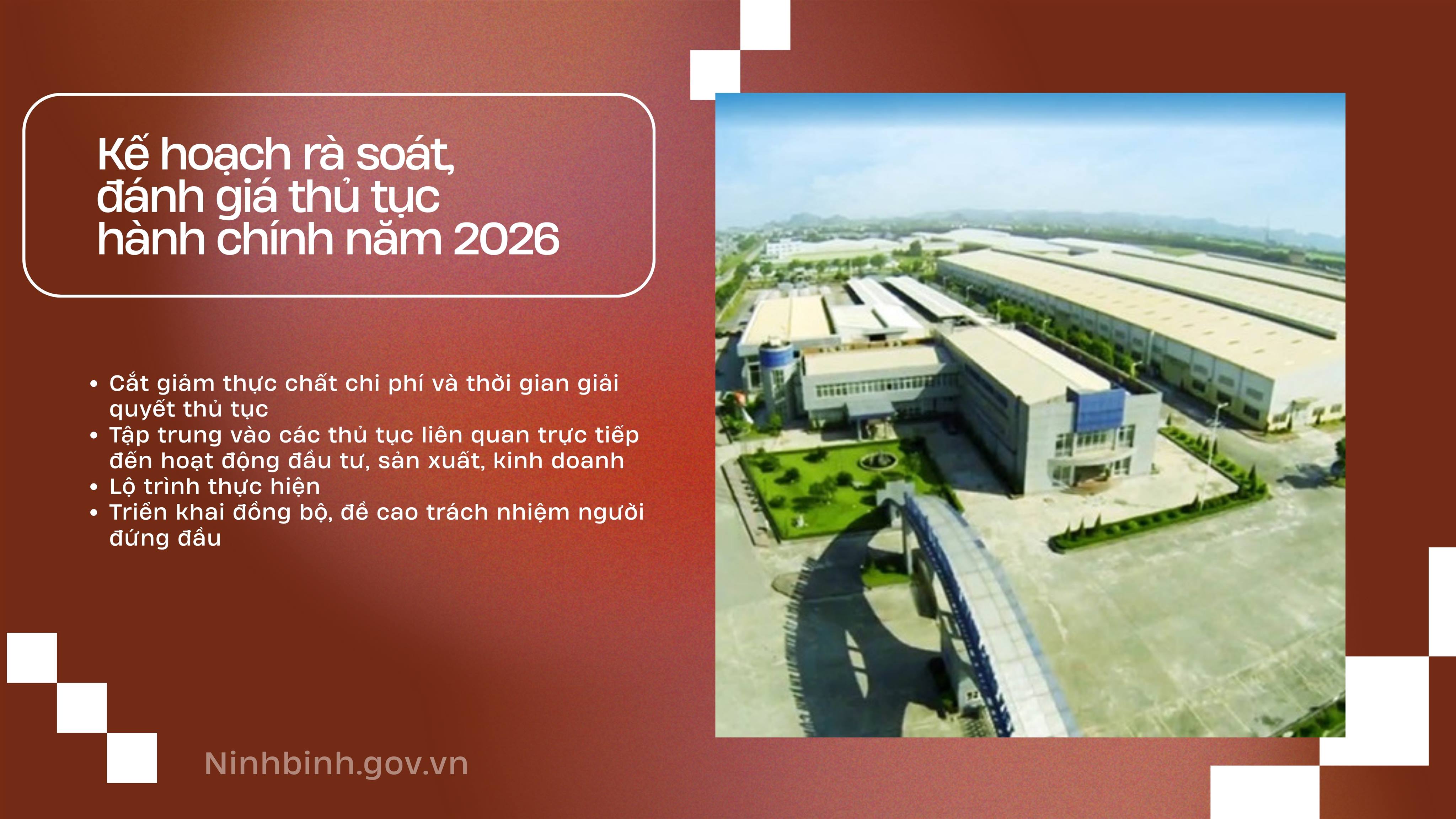 Ban Quản lý Khu kinh tế và các Khu công nghiệp tỉnh Ninh Bình ban hành Kế hoạch rà soát, đánh giá thủ tục hành chính năm 2026 Nhằm tiếp tục đẩy mạnh cải cách hành chính, cải thiện môi trường đầu tư, kinh doanh, Ban Quản... - 02:04 Công bố danh mục thủ tục hành chính mới ban hành, sửa đổi, bổ sung trong lĩnh vực công nghiệp hỗ trợ thuộc thẩm quyền giải quyết của Sở Công Thương