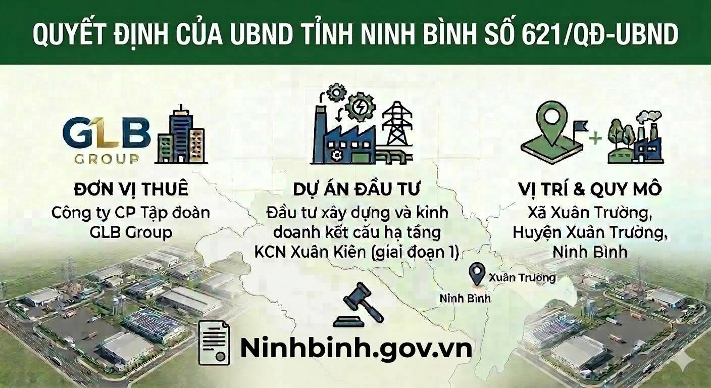 Ninh Bình: Quyết định cho Công ty Cổ phần Tập đoàn GLB Group thuê đất thực hiện Dự án Đầu tư xây dựng và kinh doanh kết cấu hạ tầng KCN Xuân Kiên (giai đoạn 1) trên địa bàn xã Xuân Trường Ngày 09/3/2025, UBND tỉnh Ninh Bình ban hành Quyết định số 621/QĐ-UBND về việc cho Công ty Cổ phần... - 08:41 Ninh Bình chủ động hưởng ứng Ngày Nước và Ngày Khí tượng thế giới năm 2026