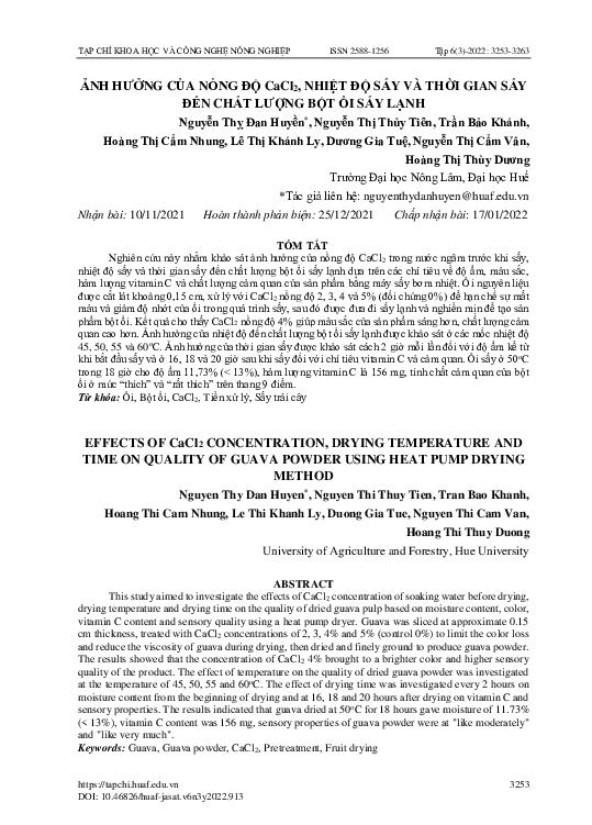 ẢNH HƯỞNG CỦA NỒNG ĐỘ CaCl2, NHIỆT ĐỘ SẤY VÀ THỜI GIAN SẤY ĐẾN CHẤT LƯỢNG BỘT ỔI SẤY LẠNH