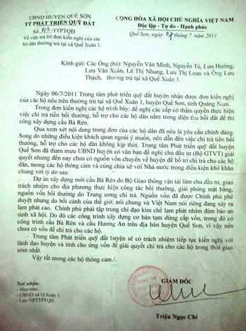 Ngày 7-7-2011, ông Triệu Ngọc Chi – Giám đốc Trung tâm Phát triển Quỹ đất H. Quế Sơn có Văn bản (số 42/TTPTQĐ) gửi chính quyền xã Quế Xuân 1 và những hộ dân bị thu hồi đất giải thích về việc chậm trễ chi trả bồi thường với nội dung: “Qua xem xét nội dung trong đơn của các hộ dân là yêu cầu chính đáng. Song do những điều kiện khách quan ngoài ý muốn, nên dẫn đến việc chi trả tiền bồi thường, hỗ trợ cho các hộ dân không kịp thời. Trung tâm Phát triển Quỹ đất huyện đã tham mưu cho UBND huyện có văn bản đề nghị chủ đầu tư (Bộ GT-VT) giải quyết nhưng đến nay chưa có nguồn vốn chuyển về huyện để bố trí chi trả cho các hộ dân, mong các hộ thông cảm và cùng chia sẻ với Nhà nước trong điều kiện khó khăn chung...”.