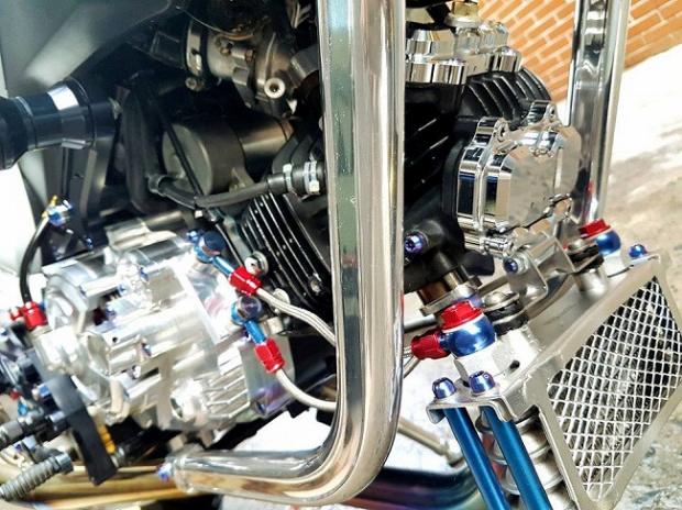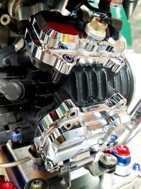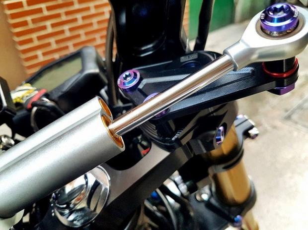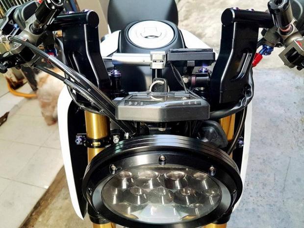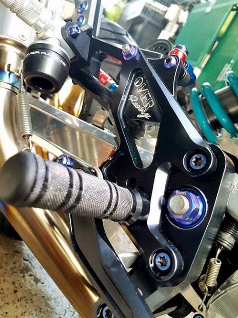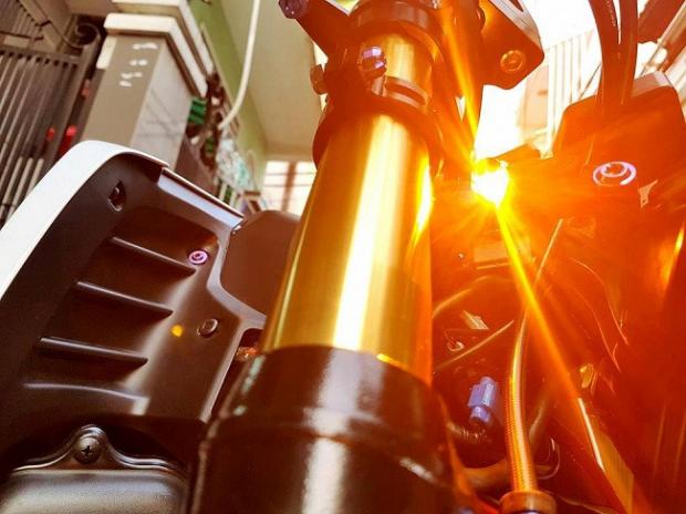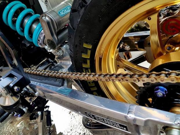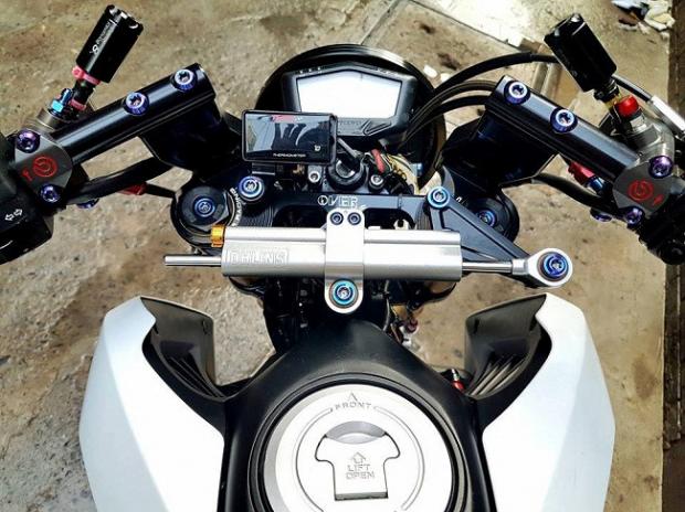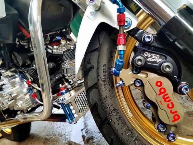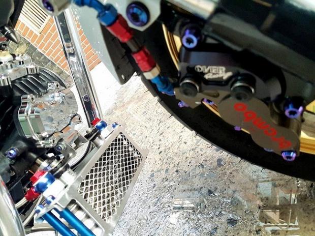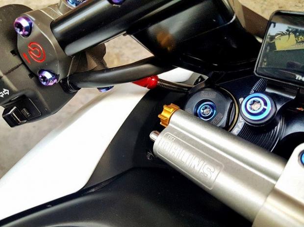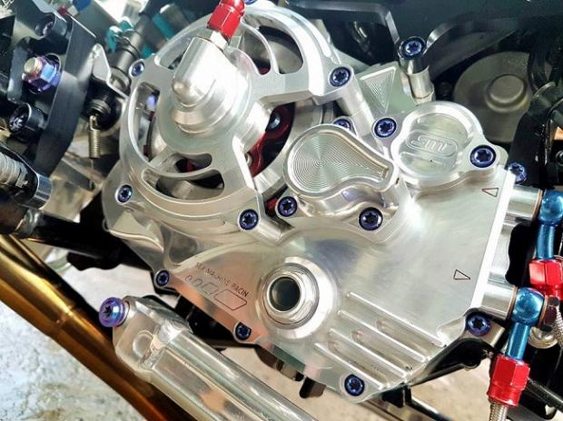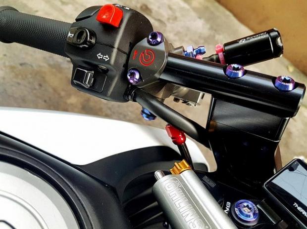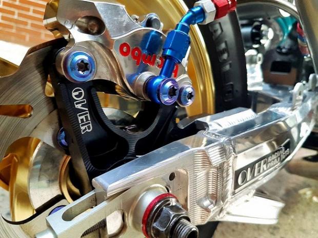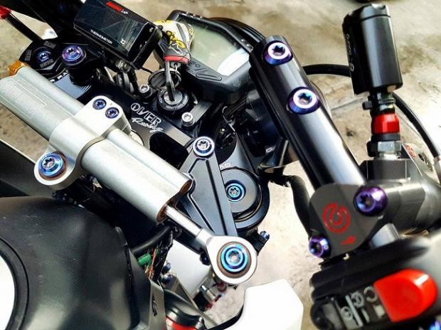 Ngoài ra, các chi tiết 'hàng hiệu' trên xe có thể kể tên bao gồm gắp sau Over nhôm mạ chrome, cặp mâm Over tiện CNC siêu nhẹ, phanh đối xứng 2 pistonBrembo Billet trước sau, đĩa phanh Galfer trước sau, thụt USD trước Ohlins với 3 chế độ chỉnh đi kèm với giảm xóc sau Nitron có tùy chỉnh bằng khí nén, hệ thống dây thông áp và dây dầu với ốc nhiều màu SMR.