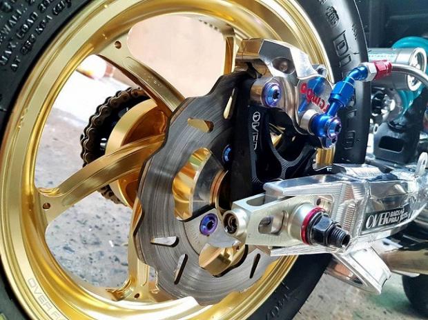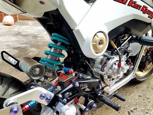 Biển số xe được lắp pat bắt vào gầm, bắt chước theo phong cách của những chiếc phân khối lớn, hệ thống tay phanh/côn Brembo, bình dầu Bonamici, đồng hồ hiển thị và đồng hồ đo acquy KOSO của Thái Lan. Chống đổ và dàn gác chân tiện CNC nguyên khối từ Over, xích DID 428 đi kèm với nhông CNC Over, pat bắt phanh tiện CNC Over, bình dầu phanh sau Brembo với pen đạp nguyên bản của dòng MSX, cùm ga Active, trợ lực Ohlins, lốp Pirelli Sporty trước, sau đồng kích thước 140/70-12. Tay nắm xe cũng được thay bằng loại Progrip mềm hơn với gù hiệu Bonamici.
