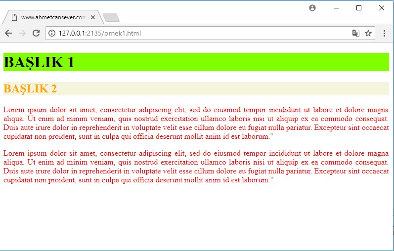 <!doctype html> <html> <head> <title>www.yazilimkodlama.com</title> <meta charset="utf-8"> <style> h1{ background-color: chartreuse; } h2{ background-color: beige; color: orange; } p{ color: red; text-align: justify; } </style> </head> <body> <h1>BAŞLIK 1</h1> <h2>BAŞLIK 2</h2> <p> Lorem ipsum dolor sit amet, consectetur adipiscing elit, sed do eiusmod tempor incididunt ut labore et dolore magna aliqua. Ut enim ad minim veniam, quis nostrud exercitation ullamco laboris nisi ut aliquip ex ea commodo consequat. Duis aute irure dolor in reprehenderit in voluptate velit esse cillum dolore eu fugiat nulla pariatur. Excepteur sint occaecat cupidatat non proident, sunt in culpa qui officia deserunt mollit anim id est laborum." </p> <p> Lorem ipsum dolor sit amet, consectetur adipiscing elit, sed do eiusmod tempor incididunt ut labore et dolore magna aliqua. Ut enim ad minim veniam, quis nostrud exercitation ullamco laboris nisi ut aliquip ex ea commodo consequat. Duis aute irure dolor in reprehenderit in voluptate velit esse cillum dolore eu fugiat nulla pariatur. Excepteur sint occaecat cupidatat non proident, sunt in culpa qui officia deserunt mollit anim id est laborum." </p> </body> </html>| 12345678910111213141516171819202122232425262728293031323334 | <!doctype html><html><head><title>www.yazilimkodlama.com</title><meta charset="utf-8"><style>h1{background-color:chartreuse;}h2{background-color:beige;color:orange;}p{color:red;text-align:justify;}</style></head><body><h1>BAŞLIK1</h1><h2>BAŞLIK2</h2><p>Lorem ipsum dolor sit amet,consectetur adipiscing elit,sed doeiusmod tempor incididunt ut labore et dolore magna aliqua.Ut enim ad minim veniam,quis nostrud exercitation ullamco laboris nisi ut aliquip ex ea commodo consequat.Duis aute irure dolor inreprehenderit involuptate velit esse cillum dolore eu fugiat nulla pariatur.Excepteur sint occaecat cupidatat non proident,sunt inculpa qui officia deserunt mollit anim id est laborum." </p> <p> Lorem ipsum dolor sit amet, consectetur adipiscing elit, sed do eiusmod tempor incididunt ut labore et dolore magna aliqua. Ut enim ad minim veniam, quis nostrud exercitation ullamco laboris nisi ut aliquip ex ea commodo consequat. Duis aute irure dolor in reprehenderit in voluptate velit esse cillum dolore eu fugiat nulla pariatur. Excepteur sint occaecat cupidatat non proident, sunt in culpa qui officia deserunt mollit anim id est laborum."</p></body></html> |