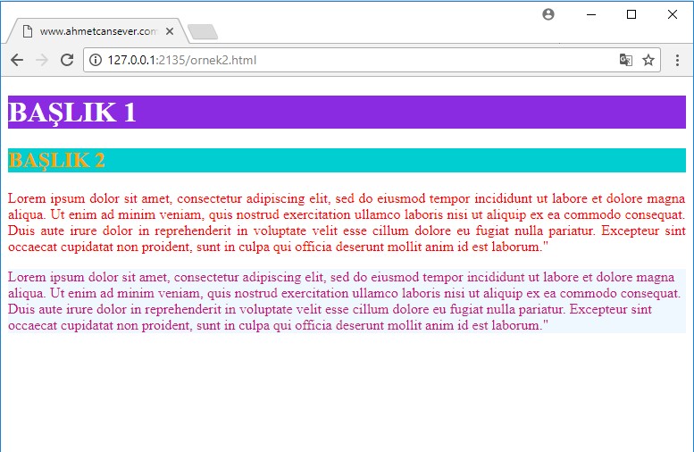 <!doctype html> <html> <head> <title>www.yazilimkodlama.com</title> <meta charset="utf-8"> <style> h1{ background-color:blueviolet; color: white; } h2{ background-color:darkturquoise; color: orange; } #p1{ color: red; text-align: justify; } #p2{ color: mediumvioletred; background-color: aliceblue; } </style> </head> <body> <h1>BAŞLIK 1</h1> <h2>BAŞLIK 2</h2> <p id="p1"> Lorem ipsum dolor sit amet, consectetur adipiscing elit, sed do eiusmod tempor incididunt ut labore et dolore magna aliqua. Ut enim ad minim veniam, quis nostrud exercitation ullamco laboris nisi ut aliquip ex ea commodo consequat. Duis aute irure dolor in reprehenderit in voluptate velit esse cillum dolore eu fugiat nulla pariatur. Excepteur sint occaecat cupidatat non proident, sunt in culpa qui officia deserunt mollit anim id est laborum." </p> <p id="p2"> Lorem ipsum dolor sit amet, consectetur adipiscing elit, sed do eiusmod tempor incididunt ut labore et dolore magna aliqua. Ut enim ad minim veniam, quis nostrud exercitation ullamco laboris nisi ut aliquip ex ea commodo consequat. Duis aute irure dolor in reprehenderit in voluptate velit esse cillum dolore eu fugiat nulla pariatur. Excepteur sint occaecat cupidatat non proident, sunt in culpa qui officia deserunt mollit anim id est laborum." </p> </body> </html>| 123456789101112131415161718192021222324252627282930313233343536373839 | <!doctype html><html><head><title>www.yazilimkodlama.com</title><meta charset="utf-8"><style>h1{background-color:blueviolet;color:white;}h2{background-color:darkturquoise;color:orange;}#p1{color:red;text-align:justify;}#p2{color:mediumvioletred;background-color:aliceblue;}</style></head><body><h1>BAŞLIK1</h1><h2>BAŞLIK2</h2><pid="p1">Lorem ipsum dolor sit amet,consectetur adipiscing elit,sed doeiusmod tempor incididunt ut labore et dolore magna aliqua.Ut enim ad minim veniam,quis nostrud exercitation ullamco laboris nisi ut aliquip ex ea commodo consequat.Duis aute irure dolor inreprehenderit involuptate velit esse cillum dolore eu fugiat nulla pariatur.Excepteur sint occaecat cupidatat non proident,sunt inculpa qui officia deserunt mollit anim id est laborum." </p> <p id="p2"> Lorem ipsum dolor sit amet, consectetur adipiscing elit, sed do eiusmod tempor incididunt ut labore et dolore magna aliqua. Ut enim ad minim veniam, quis nostrud exercitation ullamco laboris nisi ut aliquip ex ea commodo consequat. Duis aute irure dolor in reprehenderit in voluptate velit esse cillum dolore eu fugiat nulla pariatur. Excepteur sint occaecat cupidatat non proident, sunt in culpa qui officia deserunt mollit anim id est laborum."</p></body></html> |