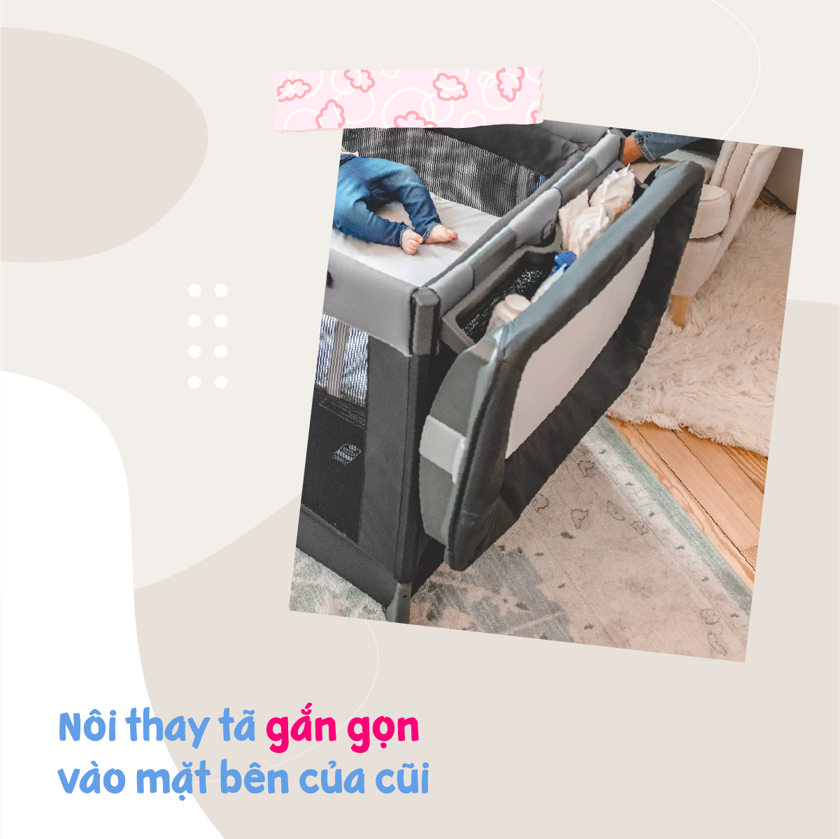 - Nôi thay tã có thể gắn gọn vào mặt bên của cũi mỗi khi không sử dụng