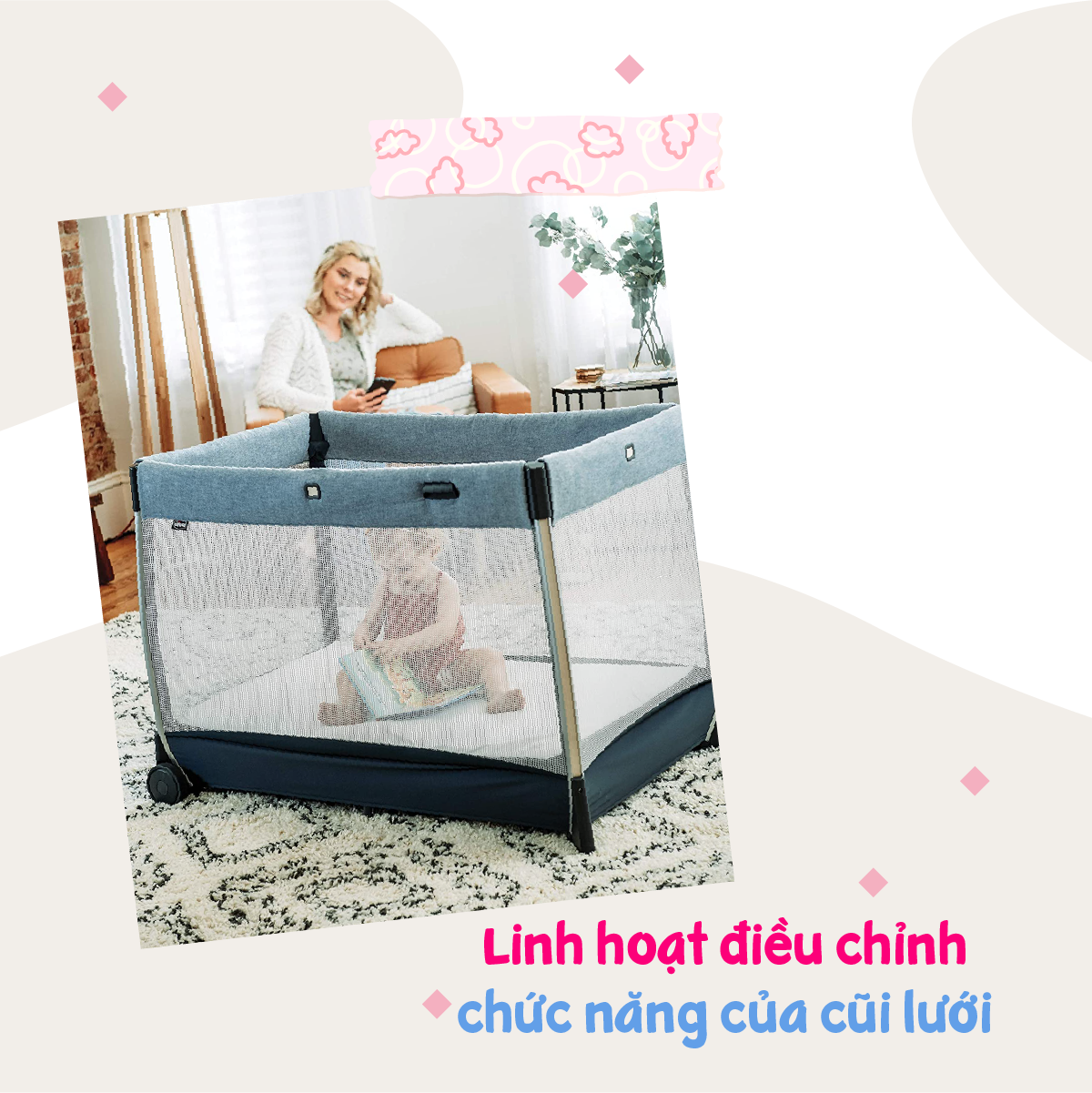 - Khi bé lớn hơn, đặc biệt trong giai đoạn tập đi, mẹ có thể tháo nôi trên để thành một chiếc cũi lưới giúp bé có thể đứng chơi hay ngồi, bò trong cũi một cách thoải mái.