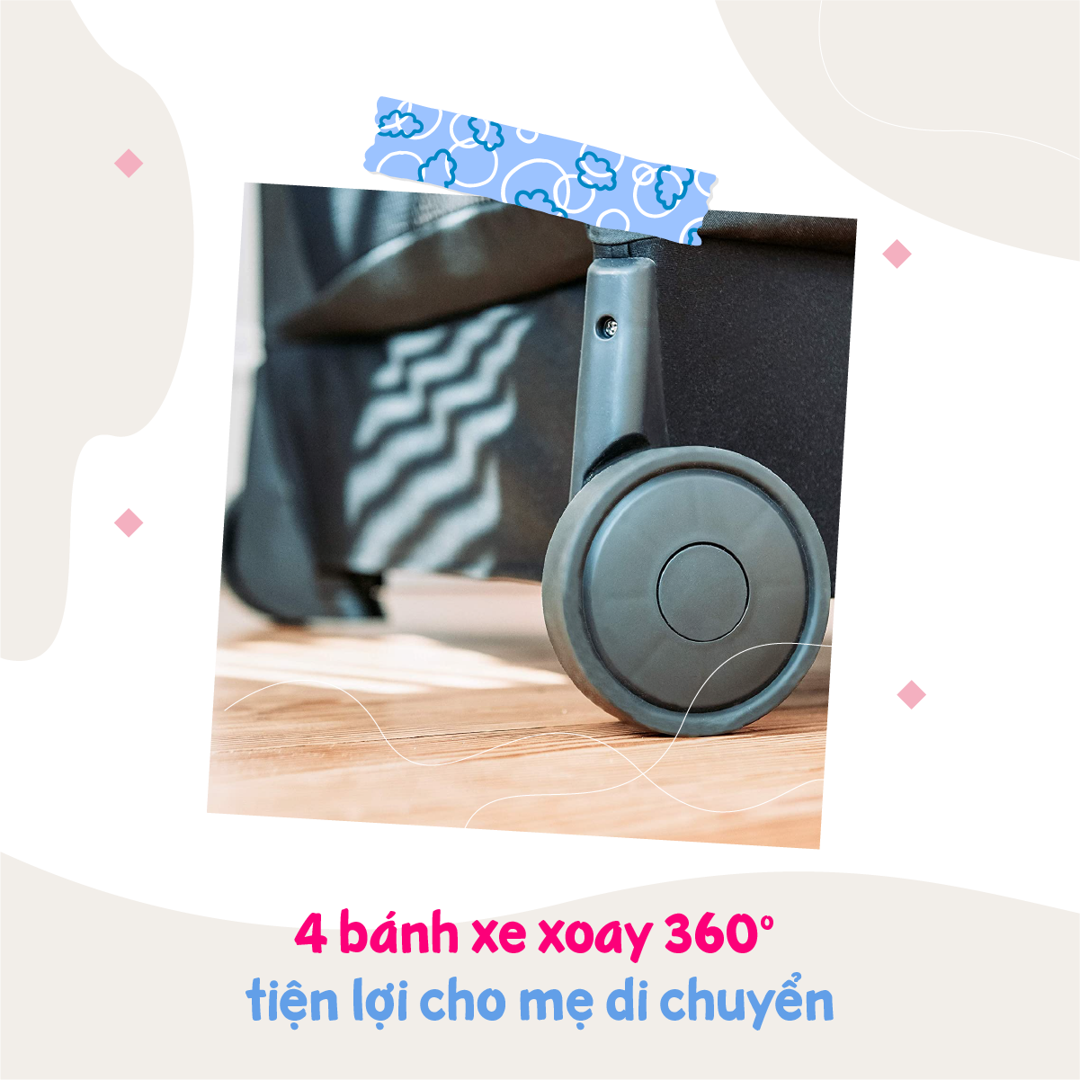 6. Cũi có 4 bánh xe xoay 360 trơn tru, bo tròn góc cạnh, không lo hỏng sàn, tiện lợi cho mẹ di chuyển cũi trong phòng