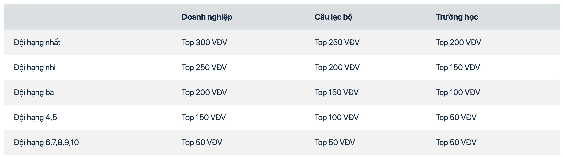 - Và có thành tích nằm trong top của các Đội đoạt giải theo bảng sau.