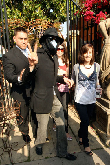 Michael Jackson đeo mặt nạ và mũ khi tới Hollywood vào 22/4/2009. Ảnh: Apega. N.T.