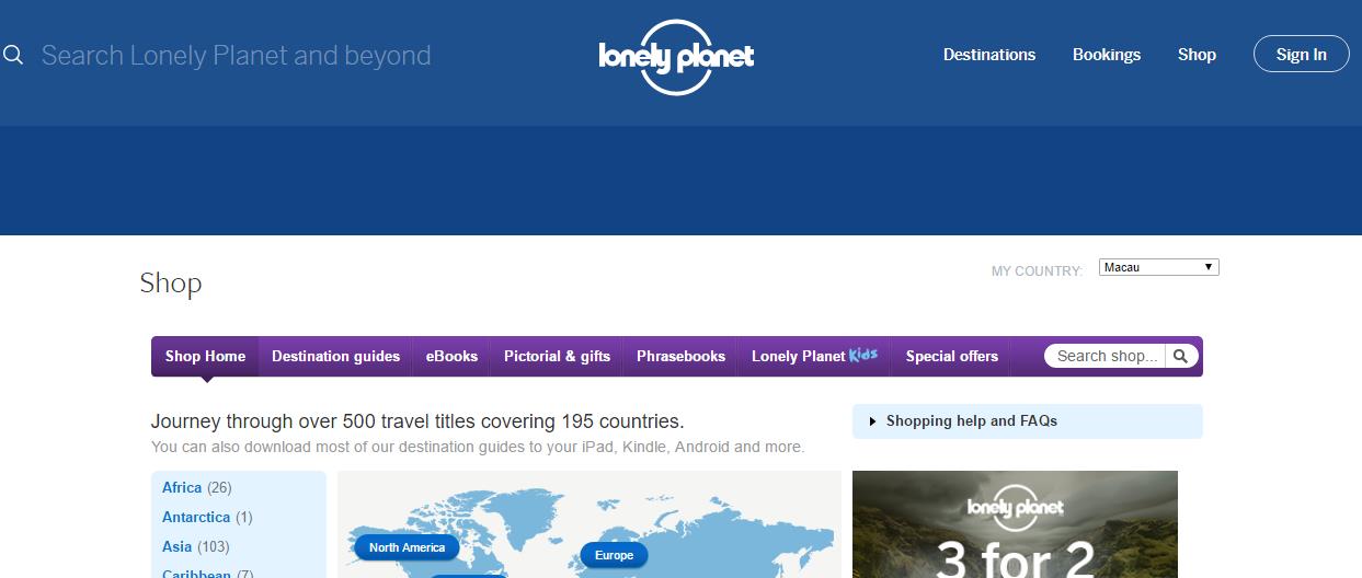 Lonely Planet đã nổi tiếng từ lâu bởi là nhà xuất bản sách hướng dẫn du lịch lớn nhất thế giới, và The Lonely Planet Shop trực tuyến cũng hoạt động khá tốt. Shop trực tuyến này cung cấp đầy đủ những dụng cụ, đồ dùng bạn cần cho chuyến phiêu lưu của mình. Không những thế bạn có thể truy cập vào website và tìm kiếm thông tin, những địa điểm hấp dẫn nhất nên đi cũng như làm thế nào để có những trải nghiệm tuyệt vời với ngân sách giới hạn.
