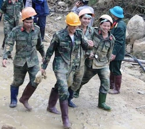 Binh nhất Hoàng Văn Thảo - Lữ đoàn Công binh 293 Bộ Tư lệnh Công binh C3, một trong những người đầu tiên tiếp cận nạn nhân nói trong vui mừng: “Đang tối, thấy ánh điện phía đối diện lóe lên và có tiếng động, vừa lúc đó tôi hô to, thấy rồi! Ngay lúc đó tôi và mọi người đã ra sức đào tới. Chỉ vài nhát đào nữa thì một lỗ thủng lớn xuất hiện. Tôi nhìn qua phía bên kia thấy nhiều người. Tôi quẳng dụng cụ, bò qua với các nạn nhân. Ngay lúc đó, các nạn nhân bên trong reo vang lên được cứu rồi!”.