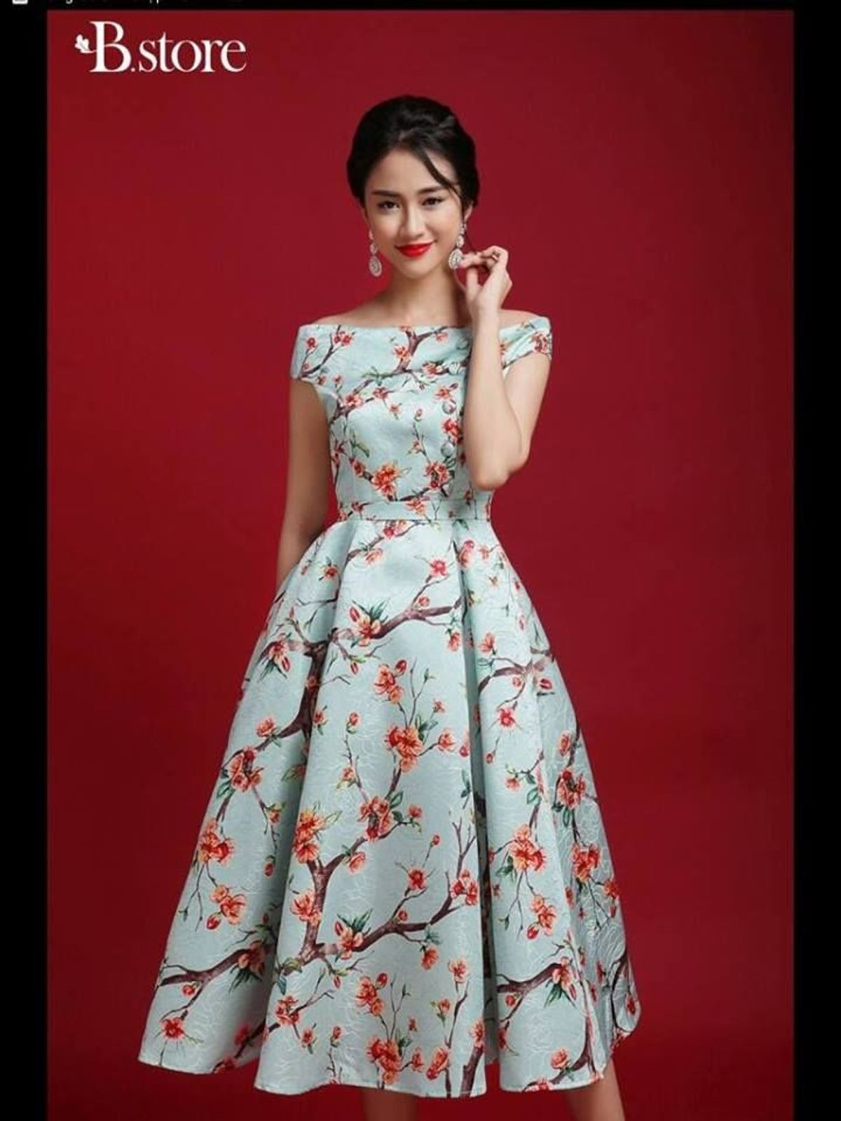 Đầm Xòe Trễ Vai Tùng Gấm In Hoa 3d