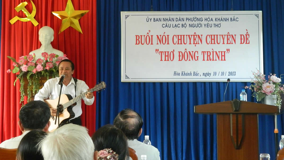 | Nhạc sỹ Đình Thậm ôm đàn hát trong một buổi nói chuyện chuyên đề thơ Đông Trình tại P. Hòa Khánh Bắc (Q. Liên Chiểu). |