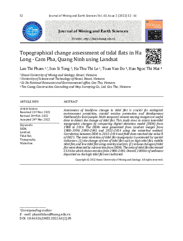 Eira GodivadownloadDownload free PDFTopographical change assessment of tidal flats in Ha Long - Cam Pha, Quang Ninh using Landsat