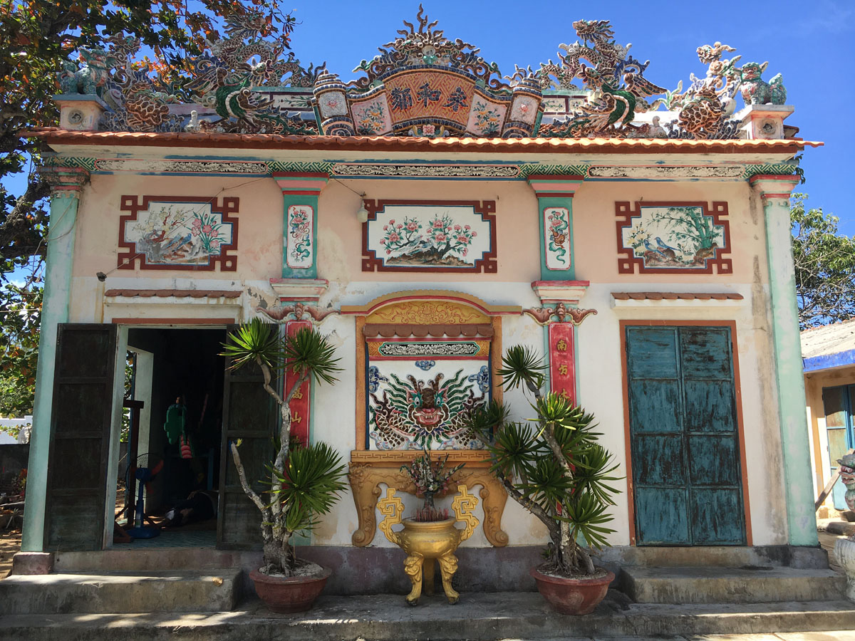 - Dinh bà Thiên Y A Na: Ở đảo Lý Sơn, dinh thờ bà Thiên Y A Na có khá nhiều ở các xã và thôn và có tên gọi khác nhau như dinh Bà, dinh Bà Trời. Một trong những dinh có giá trị về kiến trúc nghệ thuật đó là dinh bà Thiên Y A Na ở xóm Trung Yên, thôn Đông, xã An Hải (cũ) (hình 4). Dinh được xây dựng khá lâu đời bằng tranh tre và trải qua nhiều đợt tu bổ, trùng tu vào những năm Bảo Đại thứ 9 và thứ 19. Nhìn tổng thể, dinh ở vị trí rất đẹp trên triền đồi đá cao và xoay mặt về hướng Đông Nam. Quy mô dinh không đồ sộ và toàn bộ công trình như hòa lẫn vào cảnh quan thiên nhiên xung quanh. MBTT gồm bậc lên, cổng, bình phong, sân, tiền đình, chính điện và hậu tẩm. Tiền đình và chính điện có dạng 3 gian – 2 chái, hậu tẩm có dạng 1 gian. Các trang trí bờ nóc, mặt trước đẹp và tinh xảo với chủ đề quen thuộc như long, phụng, câu đối, hoa lá,… Đỉnh mái đắp nổi hình tượng lưỡng long tranh châu, các đầu đao hậu tẩm đắp hình rồng chầu, đầu hồi chính điện hình con dơi. Bên trong là hệ gỗ với trang trí, trưng bày cầu kỳ và trang nghiêm.