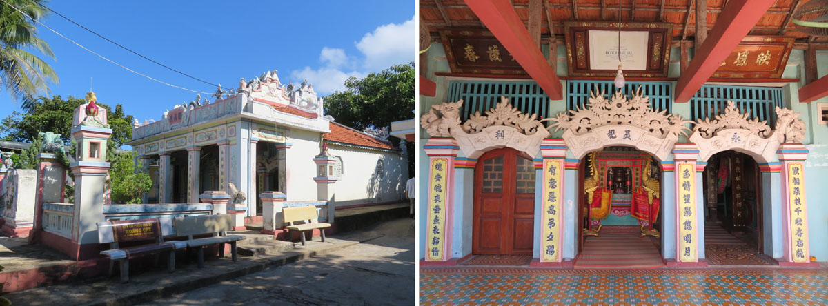 - Đình An Hải: Tọa lạc tại thôn Đông, xã An Hải (cũ) và xoay về hướng Đông Nam (hình 3). Đình xây dựng vào khoảng năm 1815 dưới thời vua Gia Long bằng vật liệu tranh, tre, gỗ. Qua thời gian, đình được tu bổ và cơi nới nhiều lần vào các năm 1820, 1926, 1938, 1943, 1999, 2007, và 2018. Đình được công nhận di tích cấp quốc gia năm 1997. Hiện đình là nơi thờ Tam hoàng Ngũ đế, Ngũ vị tiên nương, chúa Ngung man nương, tiền hiền, hậu hiền, và Thiên Y A Na (hậu tẩm). Khác với đình An Vĩnh, khuôn viên đình An Hải là một quần thể kiến trúc với các công trình khác nhau. Nhìn tổng thể, trung tâm là đình làng, gồm bình phong và 2 trụ biểu, cột cờ, sân đình, tiền đình, chính đình và hậu tẩm (hoặc hạ đình, trung đình, thượng đình). Bên phải đình (nhìn từ ngoài vào) là miếu thờ các vị tiền hiền, rồi đến miếu hoàng thành. Bên trái đình là công trình thờ các vong linh, cô hồn, rồi đến lăng thờ cá voi. Hạ đình có dạng 3 gian – 2 chái với hệ thống cửa gỗ bản khoa thường gặp ở các nhà truyền thống. Mái lợp ngói âm dương với các trang trí lưỡng long triều nhật, phụng ở bờ nóc. Bên trong với hệ kết cấu gỗ còn nguyên vẹn với các trang trí câu đối, liễn, nền lát gạch đất nung, các cột được đặt trên đá tảng chống mối mọt. Mặt đứng đình là hệ thống cửa bản khoa và có 2 tượng nghê đặt đối xứng 2 bên. Trung đình có dạng 3 gian liên kết với hạ đình bằng hệ thống máng thoát nước. Thượng đình 1 gian là nơi thờ bà Thiên Y A Na.