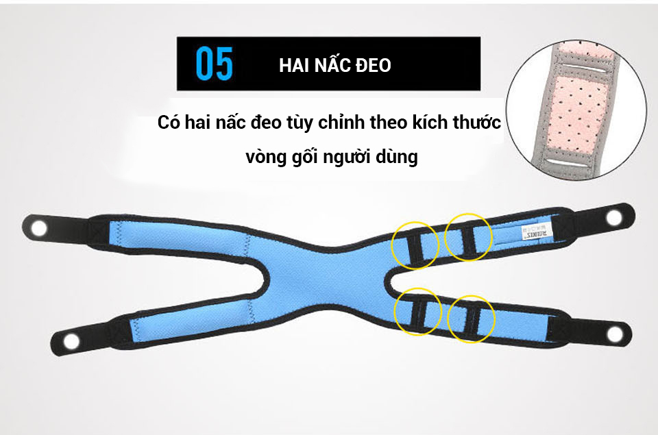 Điểm nhấn trong thiết kế: Có hai nấc đeo tùy chỉnh theo kích thước vòng gối người dùng. Sử dụng dễ dàng bằng cách luồn dây đai qua một trong hai nấc rồi kéo giãn dây dính chặt