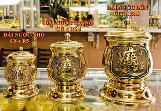 Đài thờ bằng đồng thau cao cấp được dùng đặt trên bàn thờ gia tiên để đựng nước thờ cúng vào các dịp cúng lễ hay ngày tết. Thông thường bộ đài thờ gồm 3 quả, có chân đế và nắp đậy, trong 3 cái đài thờ thì người ta thường đặt bên trong 3 cái chén xứ, đựng gạo muối nước bên trong.