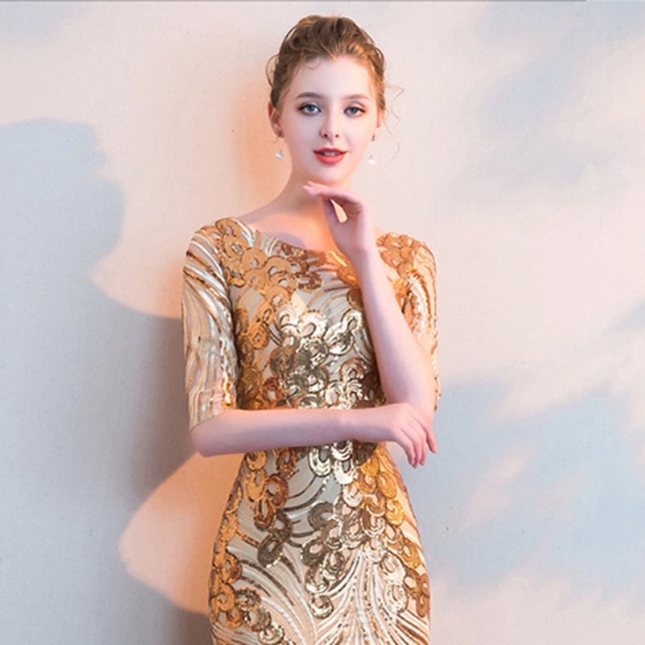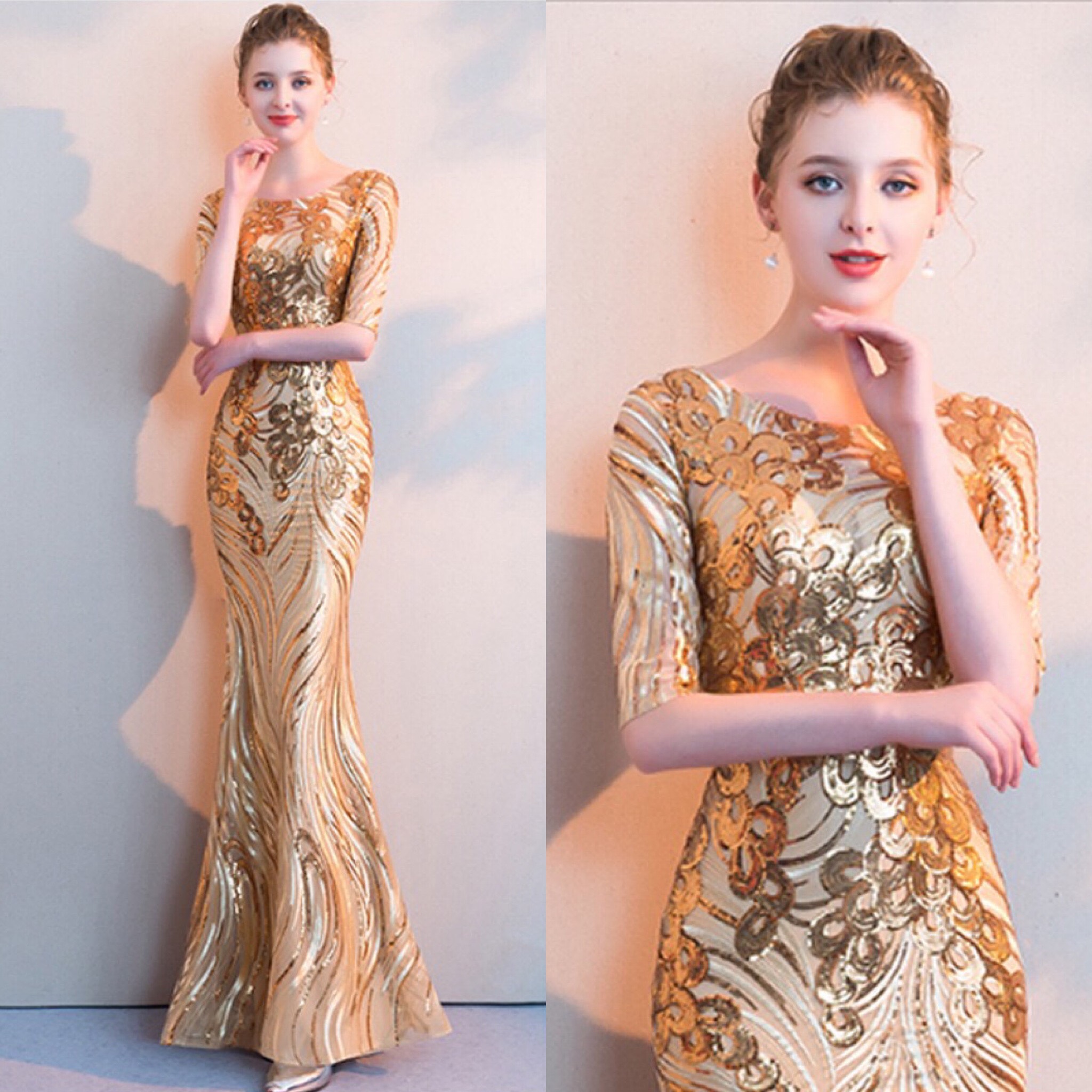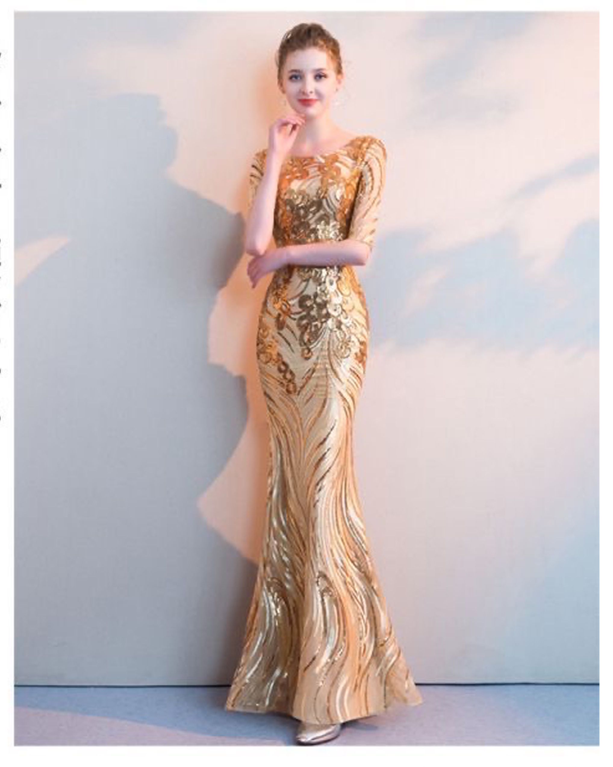 KIỂU DÁNG ĐẦM ÔM DẠ HỘI DÀI, CỔ THUYỀN, TAY NGẮN, DÂY KÉO SAU LƯNG