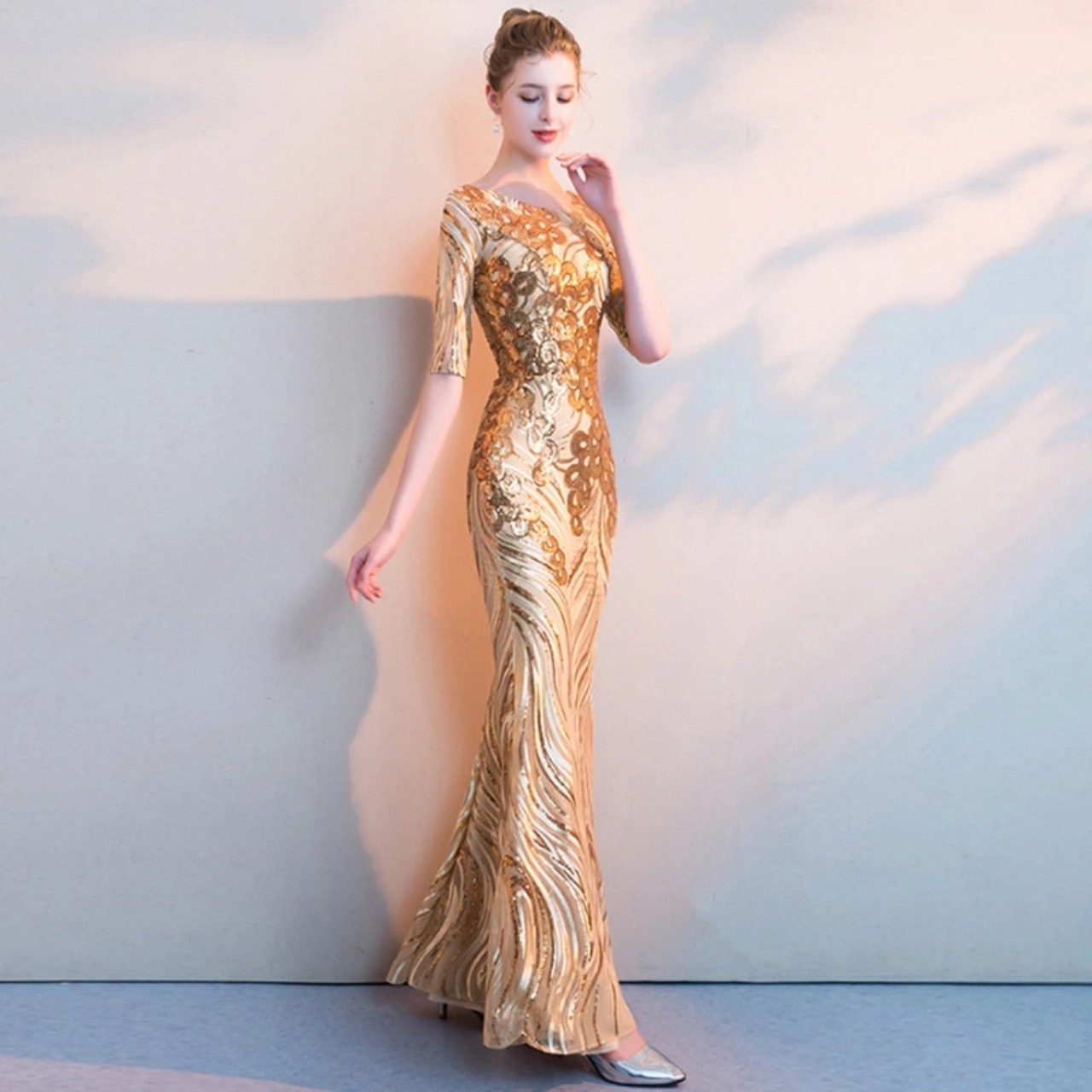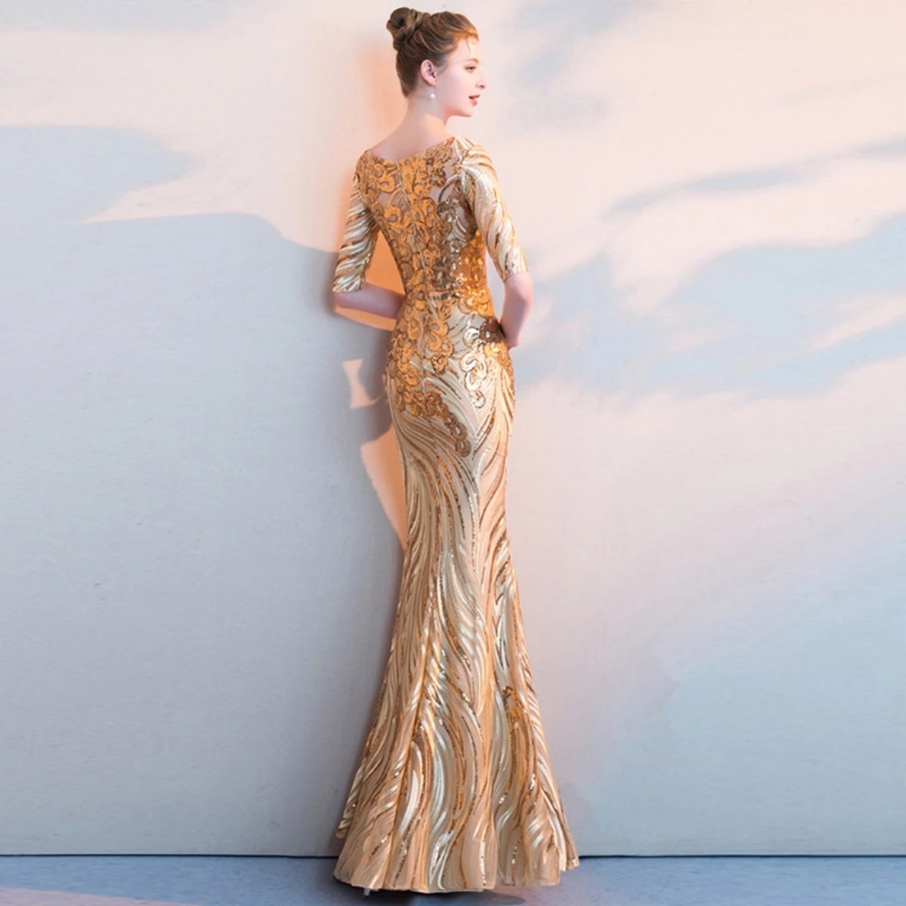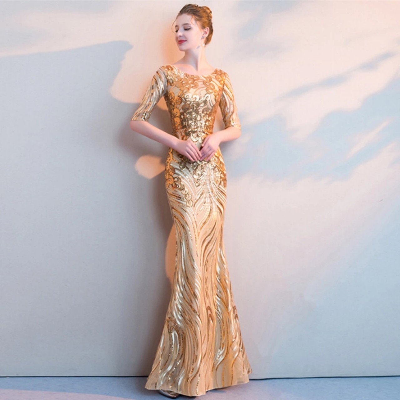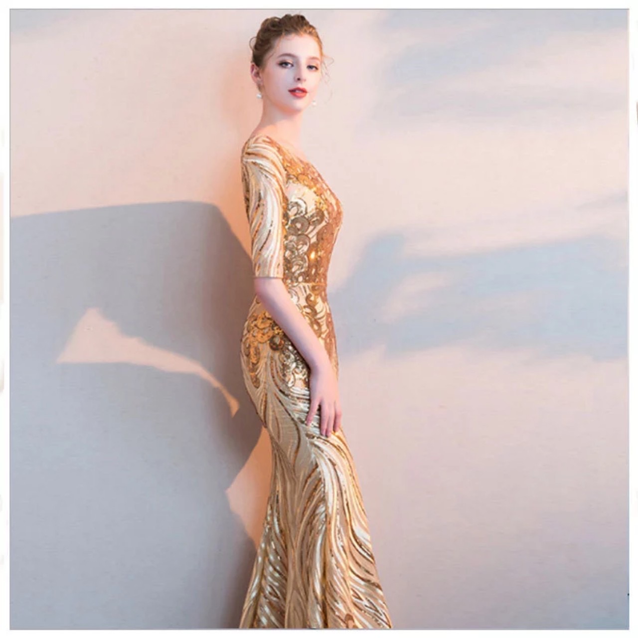 KIỂU DÁNG ĐẦM ÔM DẠ HỘI DÀI, CỔ THUYỀN, TAY NGẮN, DÂY KÉO SAU LƯNG