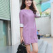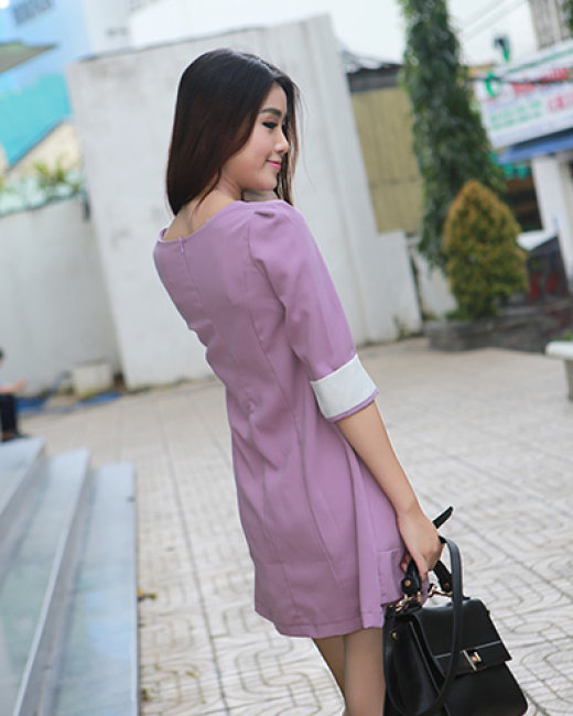 - Kiểu dáng đầm suông, cổ tròn kết hợp tay lửng có viền vải khác màu rất thích hợp cho những cô nàng nữ tính.