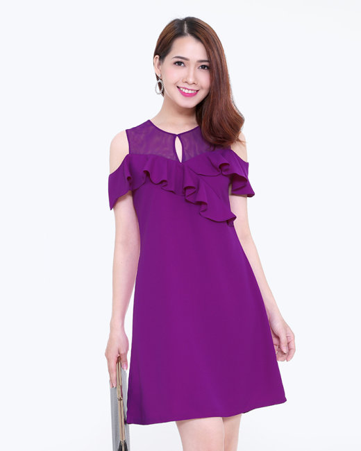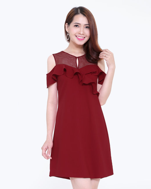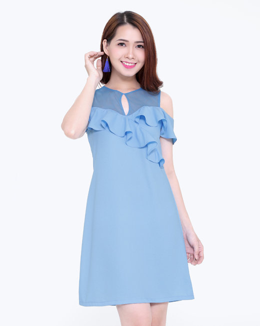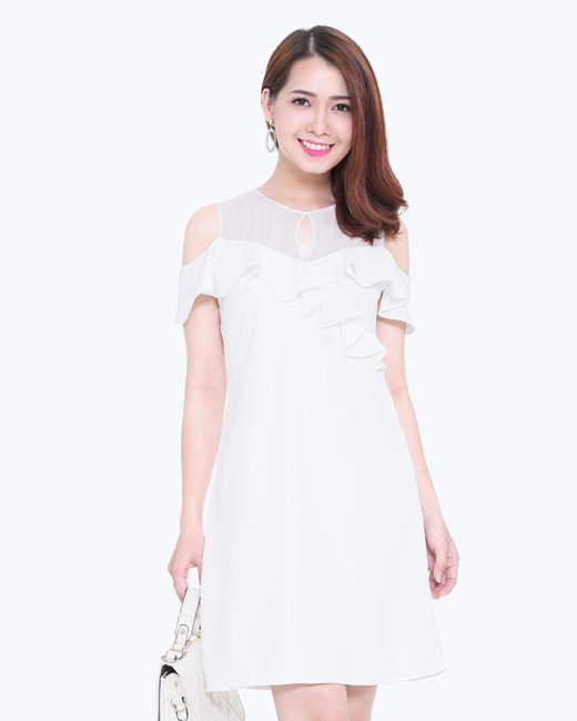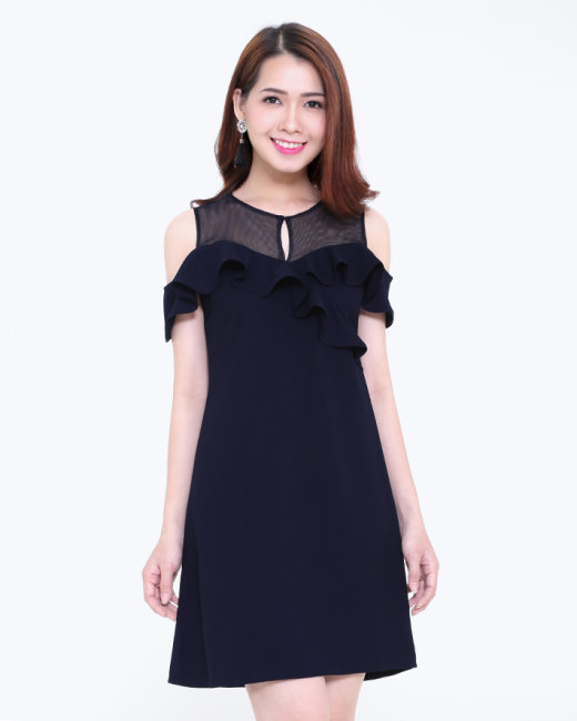 - Kiểu dáng: Đầm form suông, cổ tròn, tay trễ, phối bèo