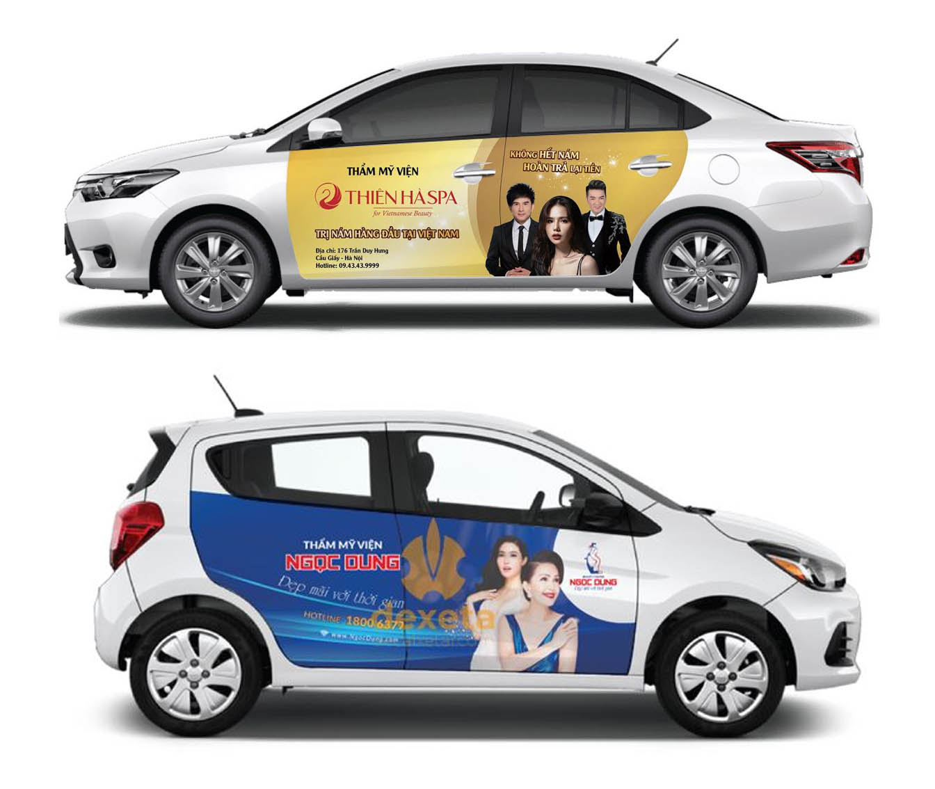 - Dán decal xe ô Tô : So với các hình thức quảng cáo trên các loại xe khác thì quảng cáo trên xe ô tô có một số các ưu điểm và lợi thế hơn như giá rẻ cùng với chi phí thi công thấp, chế độ hiển thị quảng cáo lớn hơn so với các xe khác, xe chạy khắp mọi nẻo đường giúp việc quảng bá hiệu quả hơn.