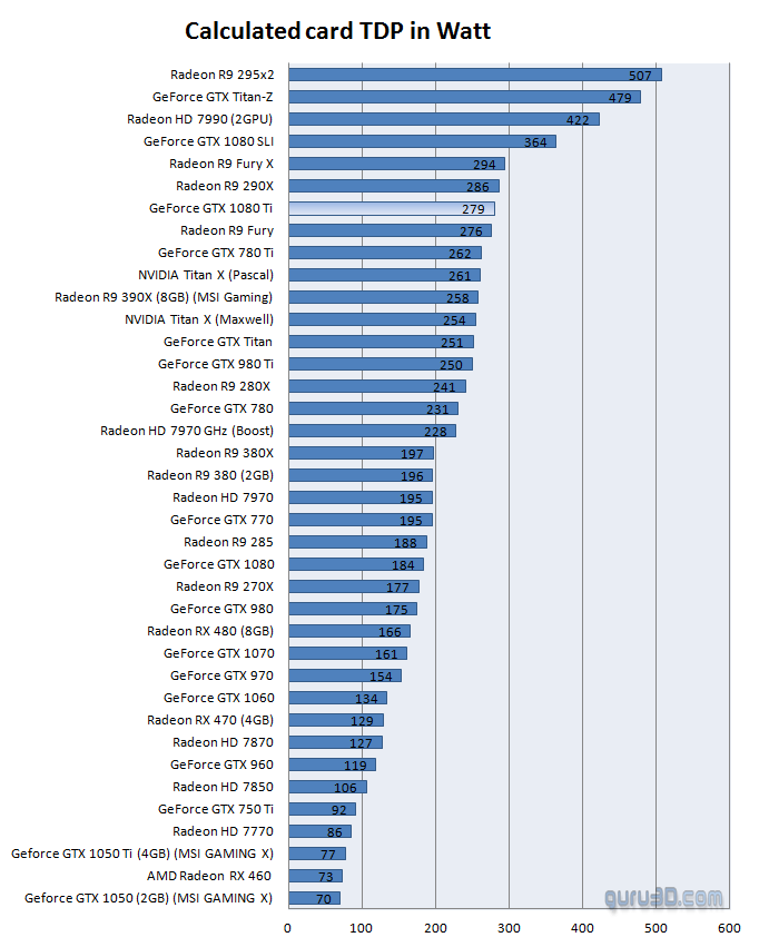 Nhìn vào biểu đồ dưới đây, nếu so sánh với GTX 1080, thì 1080 Ti đòi hỏi một bộ nguồn khỏe hơn rất nhiều khi ngốn tới gần 280 W điện. Trong khi đó GTX 1080 vốn là một sản phẩm rất mạnh mà chỉ đòi hỏi có 184 W TDP mà thôi. Thậm chí 1080 Ti còn vượt mặt cả Titan X phiên bản Pascal nữa: