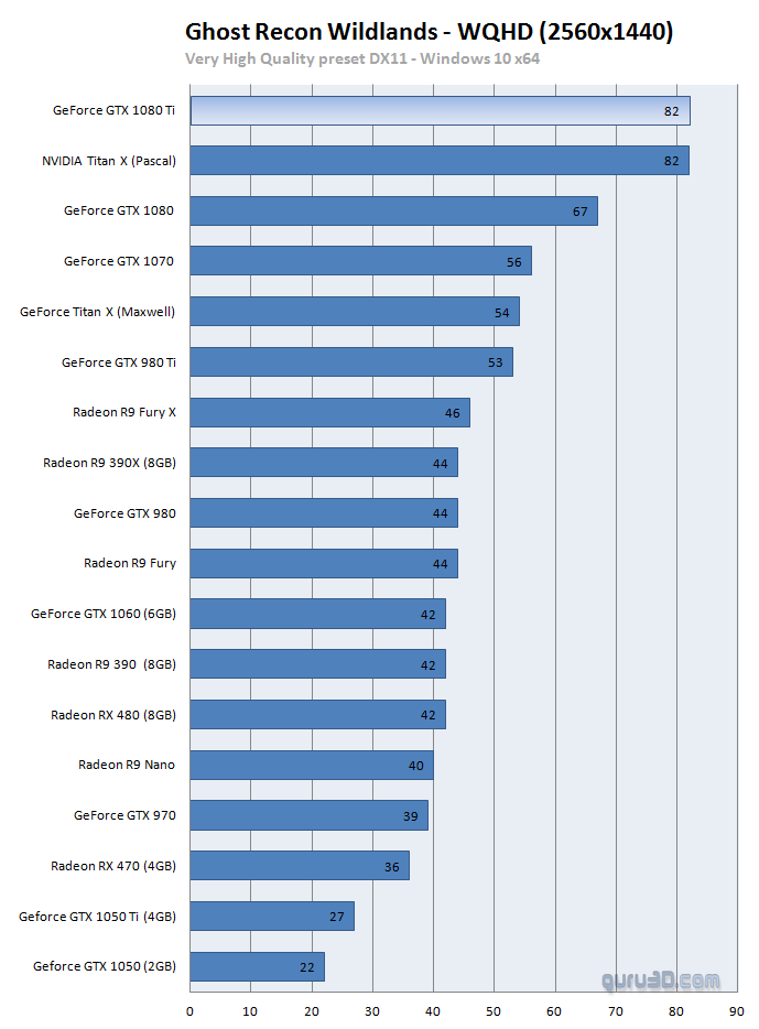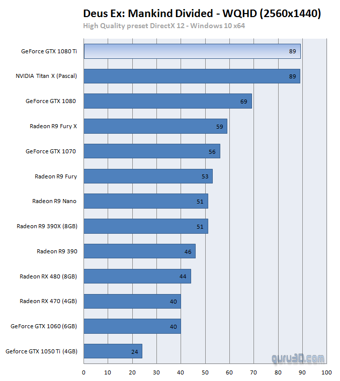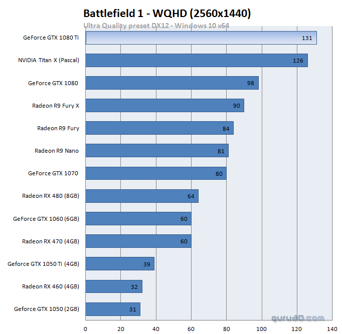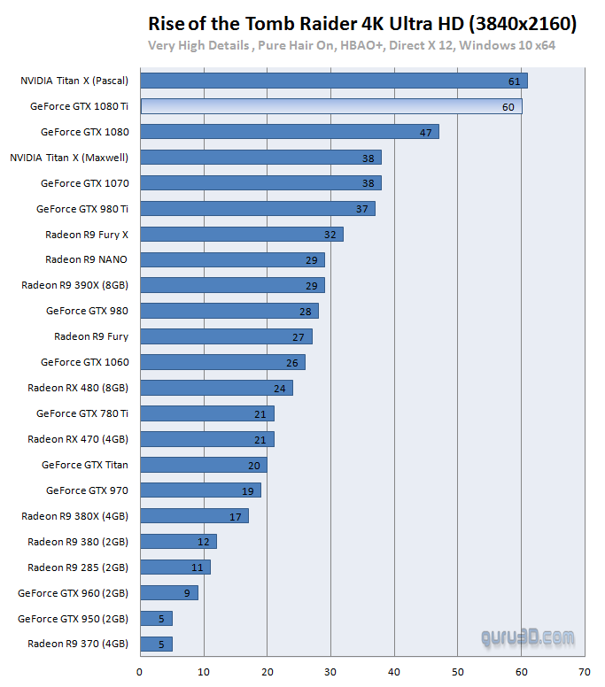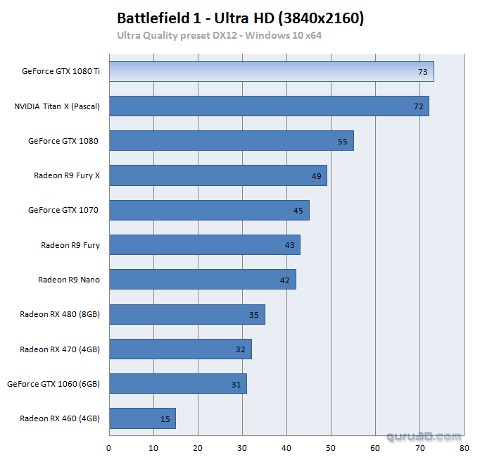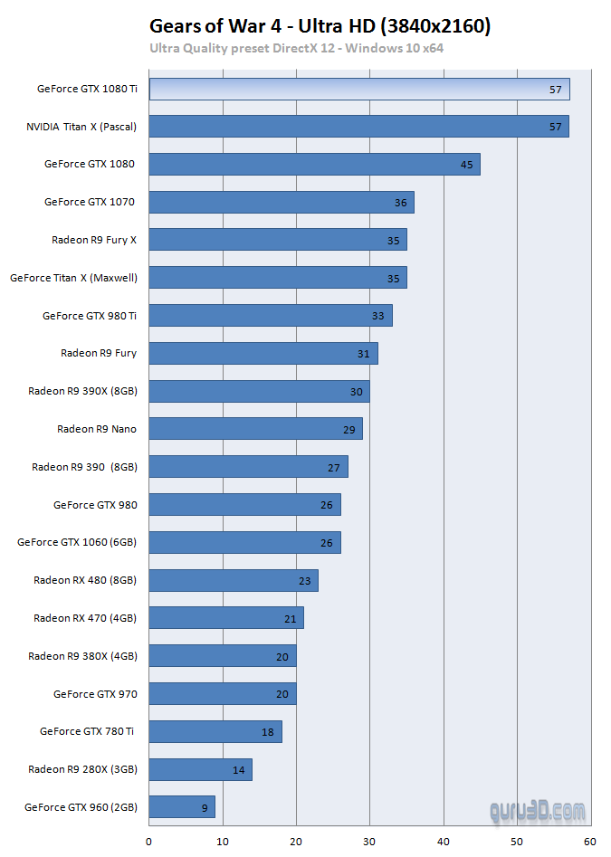 Thông thường, những đời card đồ họa có hậu tố "Ti" của dòng GeForce GTX đều chỉ mạnh hơn phiên bản gốc khoảng 15 đến 25%, thế nhưng với GTX 1080 Ti, siêu phẩm này mạnh hơn GTX 1080 những 35%. Con số này được dựa trên kết quả thử nghiệm với nhiều game đỉnh ở độ phân giải 1440p và 4K: Battlefield 1, Crysis 3, Rise of the Tomb Raider, Deus Ex: Mankind Divided, Doom và The Witcher 3.