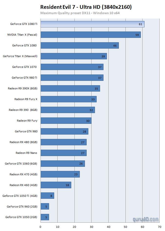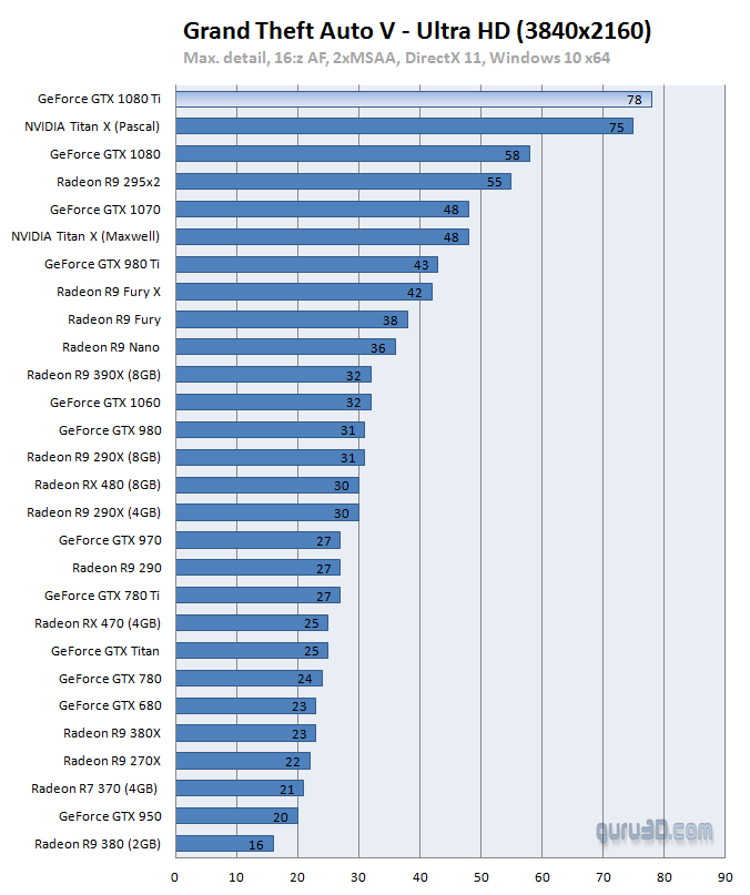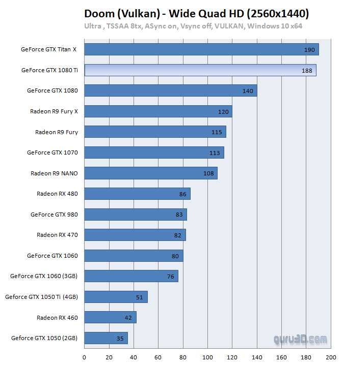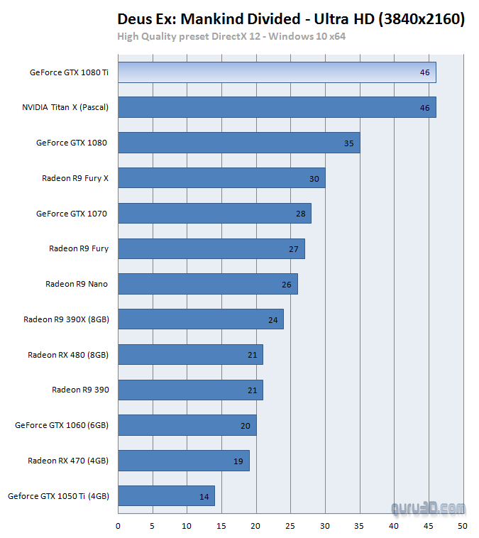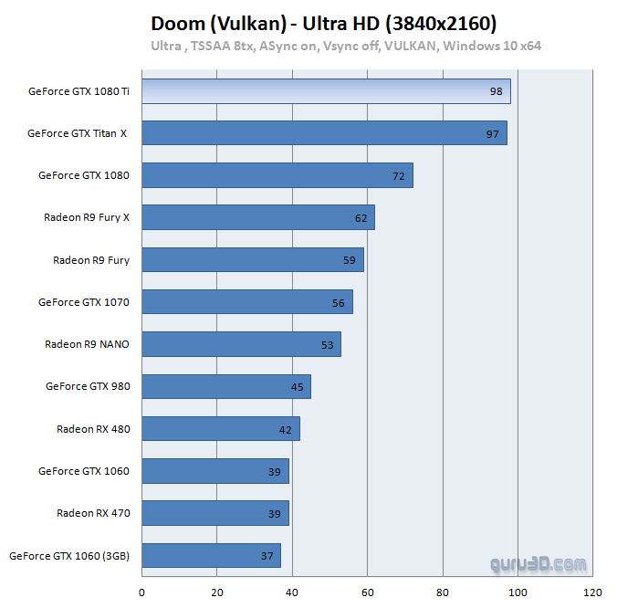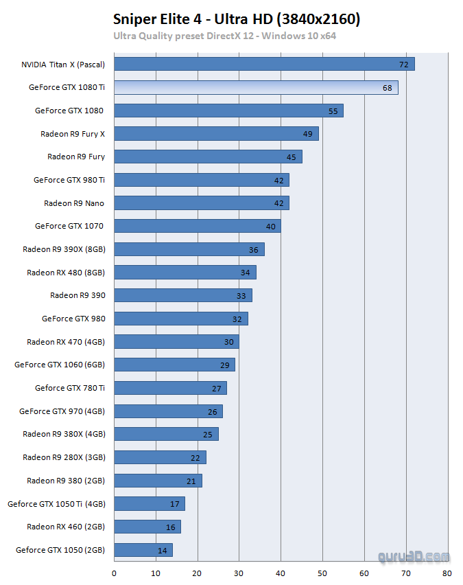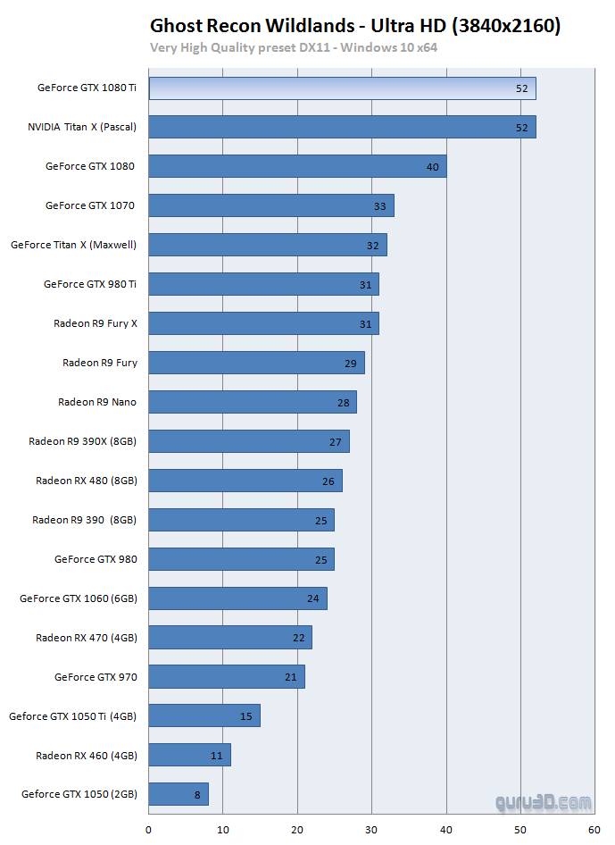 Thông thường, những đời card đồ họa có hậu tố "Ti" của dòng GeForce GTX đều chỉ mạnh hơn phiên bản gốc khoảng 15 đến 25%, thế nhưng với GTX 1080 Ti, siêu phẩm này mạnh hơn GTX 1080 những 35%. Con số này được dựa trên kết quả thử nghiệm với nhiều game đỉnh ở độ phân giải 1440p và 4K: Battlefield 1, Crysis 3, Rise of the Tomb Raider, Deus Ex: Mankind Divided, Doom và The Witcher 3.
