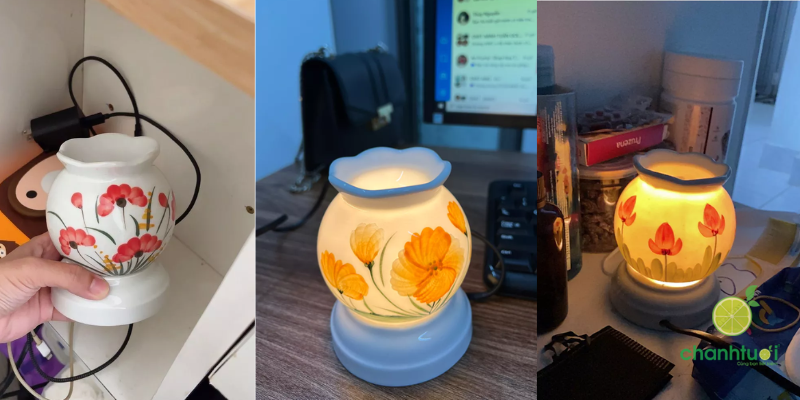 Việc dùng đèn cũng rất đơn giản: chỉ cần cắm điện, đổ nước vào đĩa khoảng 1/2 – 2/3, nhỏ 3–5 giọt tinh dầu lên, bật đèn và tận hưởng hương thơm lan tỏa khắp phòng. Bạn có thể chọn tinh dầu theo mục đích: đuổi muỗi với sả java, sả chanh hay tràm gió; thư giãn nhẹ nhàng với ngàn hoa, trà xanh, hoa ly; ngủ ngon với oải hương hay trầm hương; hay tạo không gian ấm áp, quyến rũ với quế, hoa nhài, hoa hồng.