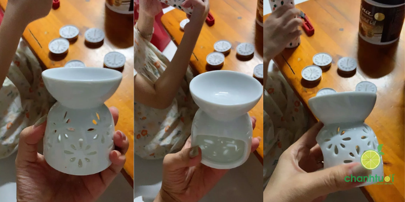 Nhỏ từ 3–5 giọt tinh dầu vào phần nước trong đĩa.