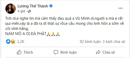 Diễn viên Lương Thế Thành bàng hoàng: "Trời ơi, em nghe tin mà cảm thấy đau quá anh Vũ Minh ơi, người anh mà em rất quỹ mến,vậy là anh đã ra đi thật sự rồi, em cầu mong cho linh hồn anh sớm về cõi vĩnh hằng. Nam mô A Di Đà Phật".