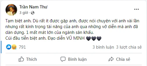 Bên dưới bài viết thông báo của siêu mẫu Xuân Lan, nhiều nghệ sĩ như NSƯT Mỹ Uyên, Lê Dương Bảo Lâm, Duy Khương, Khả Như… bày tỏ sự tiếc thương trước sự ra đi của đạo diễn Vũ Minh.