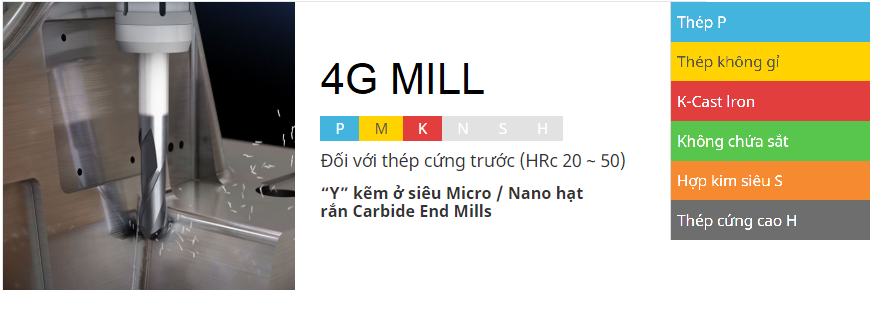 MÃ SỐ: 4G MILL SEMD98 2me Ball Nose R0.05-R12.5 4G MILL SEM846 2me Long Neck Ball Nose R0.05-R6.0 4G MILL SEM846 2me Long Neck Ball Nose (6mm Shank) R0.25-R1.0 4G MILL SEMD99 2me Corner Radius D0.2-D20.0 4G MILL SEME61 2me Long Neck Corner Radius D0.2-D20.0 4G MILL SEME01 4me Corner Radius D1.0-D20.0 4G MILL SEME64 4me Long Neck Corner Radius D1.0-D20.0 4G MILL SEME35 2me D0.03-D25.0 4G MILL SEME70 2me Long Length D1.0-D25.0 4G MILL SEM845 2me Long Neck D0.1-D12.0 4G MILL SEME36 4me D0.8-D25.0 4G MILL SEME71 4me D1.0-D20.0 4G MILL SEME72 4me Long Length D1.0-D25.0 4G MILL SEME73 4me Long Neck D1.0-D12.0 4G MILL SEME75 6me 45° Helix D6.0-D20.0 Vui lòng liên hệ: