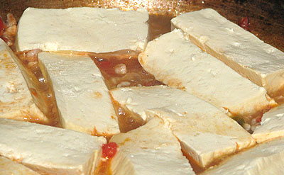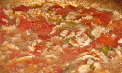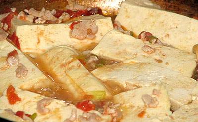 Cho đậu phụ vào hỗn hợp tôm-thịt-cà chua, để mỗi mặt khoảng 2-3 phút cho đậu ngấm nước sốt.