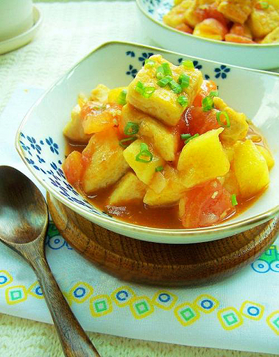 Đậu phụ mềm ngậy thơm mùi dứa chín Nguyên liệu: Đậu phụ Dứa tươi Tỏi băm Muối tiêu Cà chua tươi Xốt cà chua Bột bắp Hành xanh Cách làm: