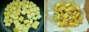 Đặt chảo lên bếp, đun nóng chút dầu ăn rồi cho đậu vào chiên Khi đậu chín vàng thì gắp ra đĩa có giấy thấm dầu