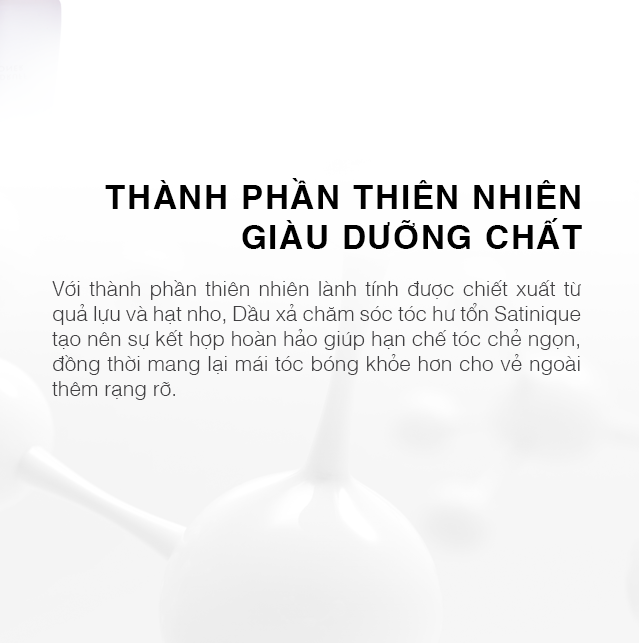 Dầu xả chăm sóc tóc hư tổn SATINIQUE với công nghệ ENERJUVE giúp phục hồi vẻ đẹp tự nhiên của mái tóc, đồng thời chiết xuất quả lựu và hạt nho giúp tóc ít chẻ ngọn và trông bóng khỏe hơn.