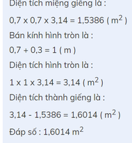 Bán kính của cái giếng hình tròn đó là: 1,6 : 2 = 0,8 ( m )Bán kính của thành giếng là: 0,8 + 0,3 = 1,1 ( m ) Diện tích thành giếng là: 1,1 x 1,1 x 3,14 = 3,7994 ( m2m2 ) Đáp số: 3,7994 m2m2