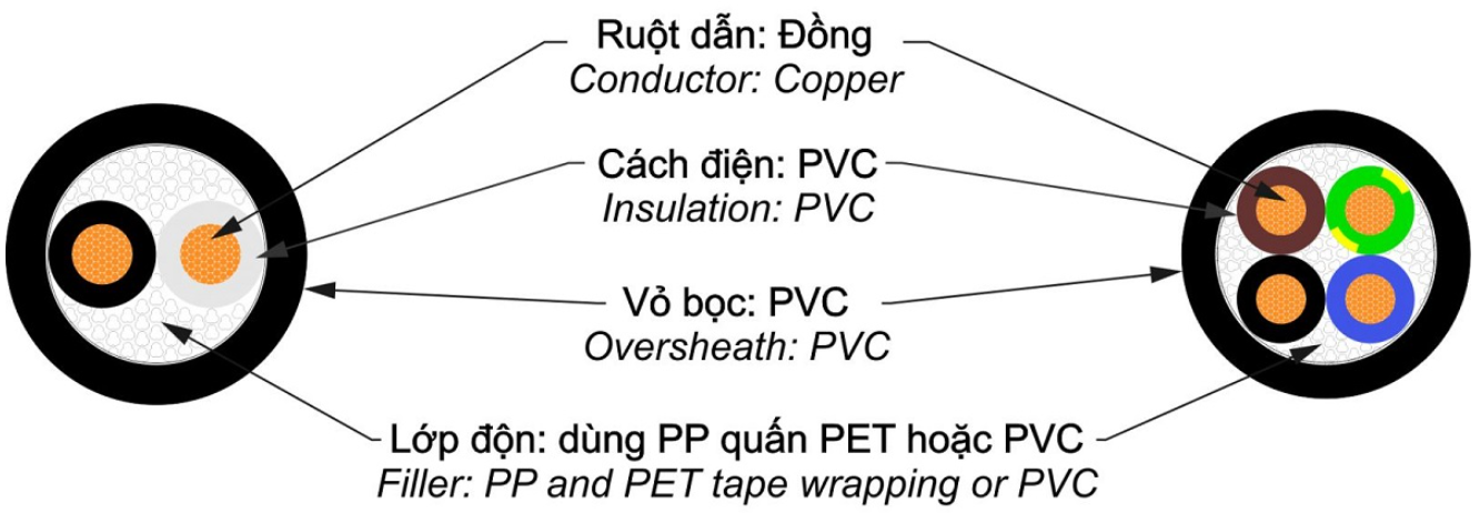 - Cáp ba lõi: Xanh lam, nâu, đen